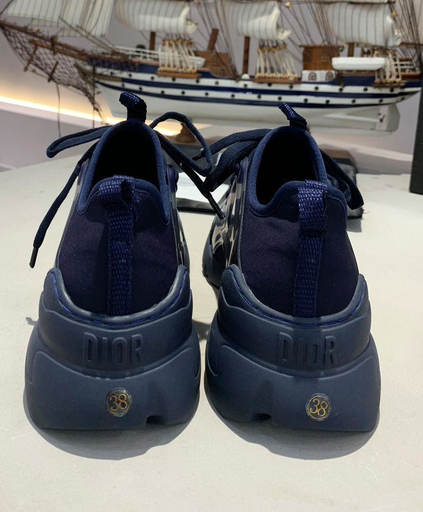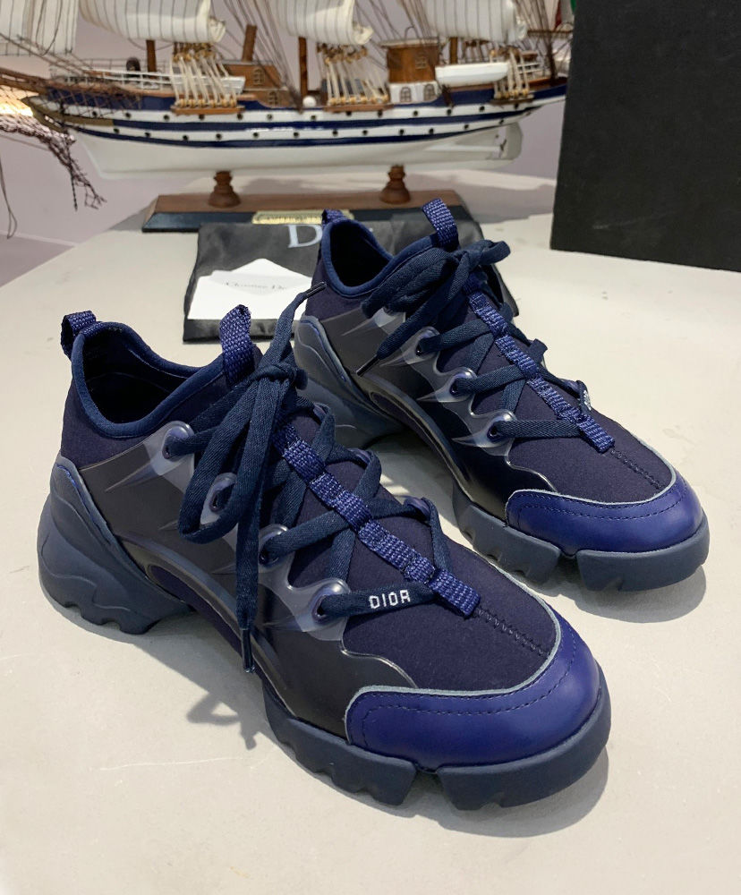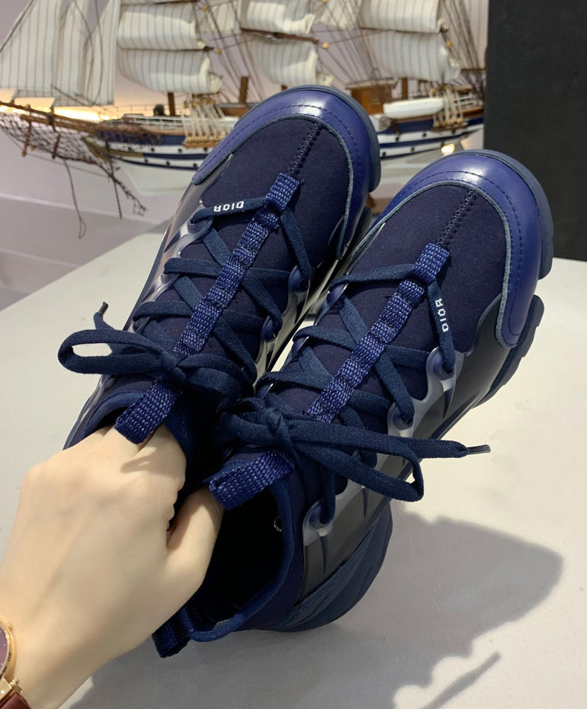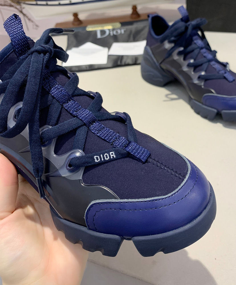 The D-Connect is Maria Grazia Chiuri’s modern and bold interpretation of an essential wardrobe piece—the sneaker. Made with indigo blue neoprene, a color very dear to Mr. Dior, it features transparent rubber yokes and a wrap-around rubber sole. The grosgrain ribbon stitched on the upper compliments the tone-on-tone laces with the’ D.I.O.R’. signature.