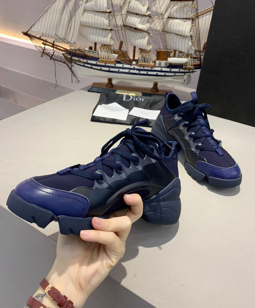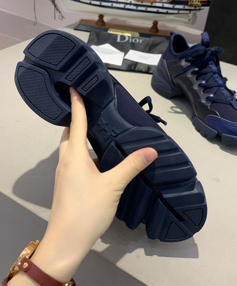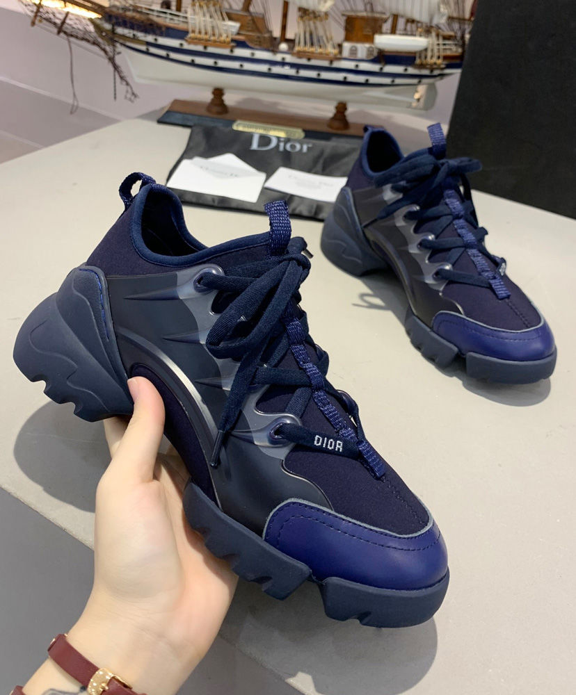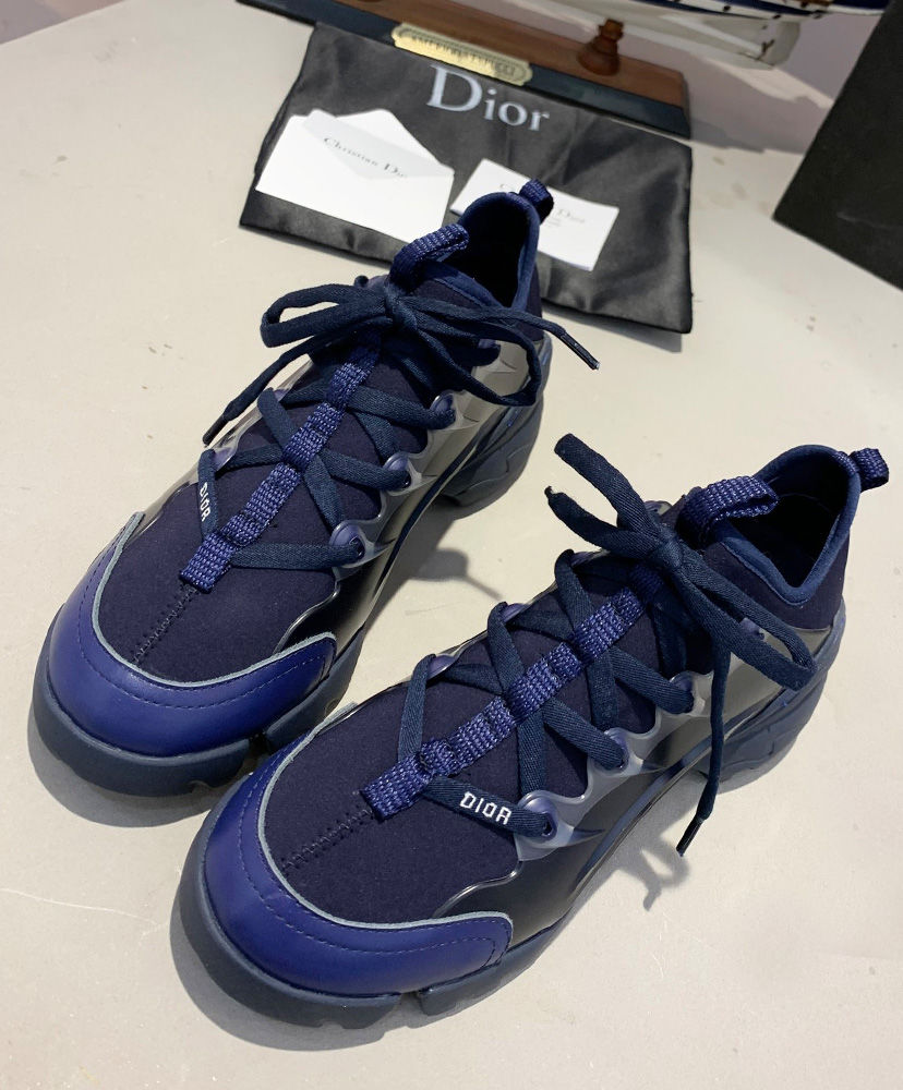 The D-Connect is Maria Grazia Chiuri’s modern and bold interpretation of an essential wardrobe piece—the sneaker. Made with indigo blue neoprene, a color very dear to Mr. Dior, it features transparent rubber yokes and a wrap-around rubber sole. The grosgrain ribbon stitched on the upper compliments the tone-on-tone laces with the’ D.I.O.R’. signature.