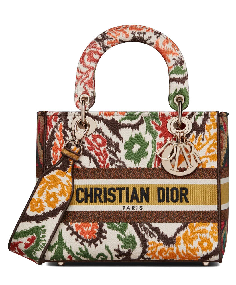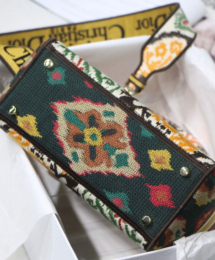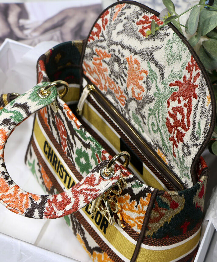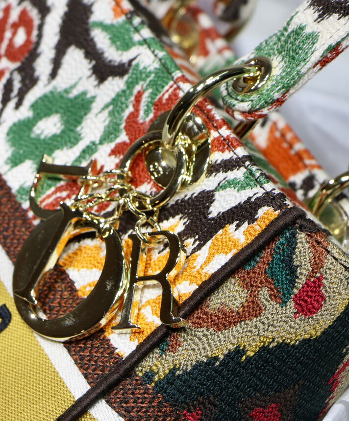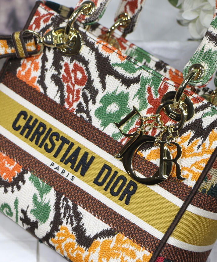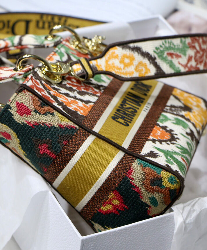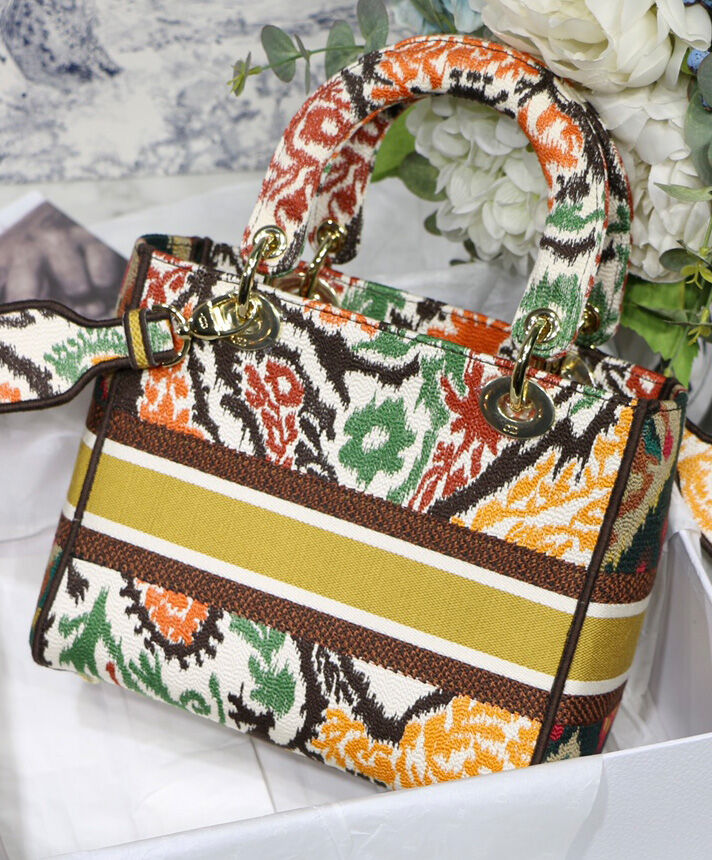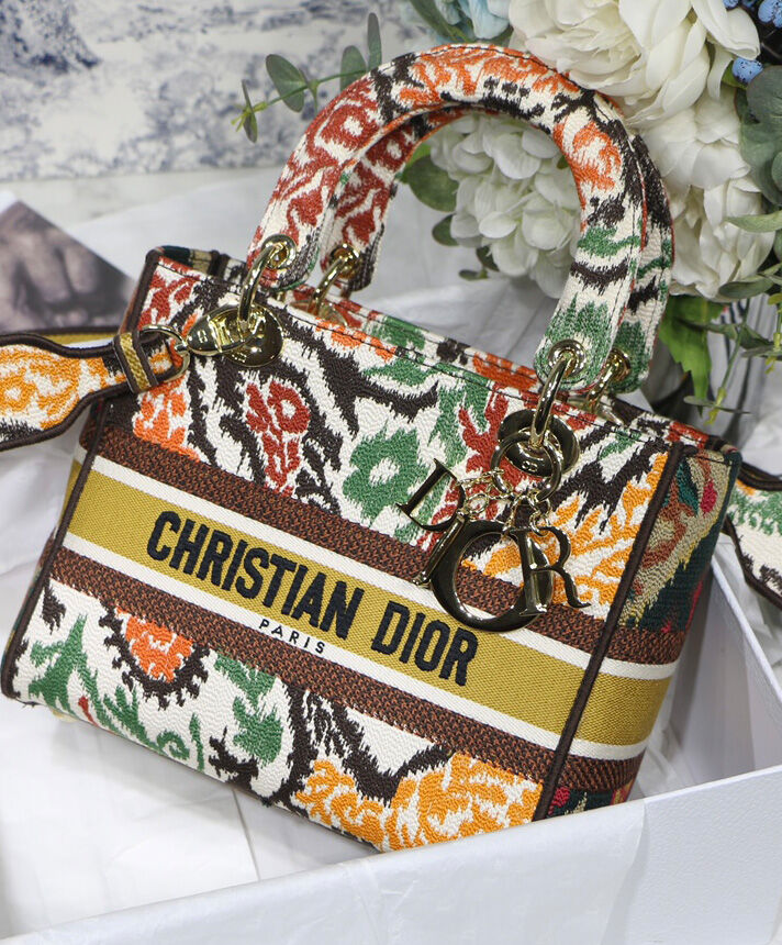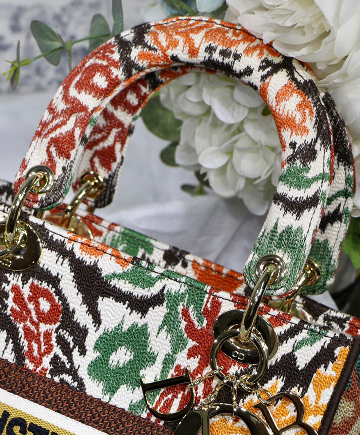 This Lady D-Lite handbag combines classic elegance with the fashionable look of the Dior brand. The whole body is decorated with multi-color Dior Paisley pattern embroidery, with sharp contrast and modern fashion. The front is decorated with the “Christian Dior” logo, with a textured light gold-finished metal “DIOR” pendant, which adds a touch of agility to the exquisite silhouette. Medium-sized model, with a detachable double-sided embroidery wide shoulder strap, which can be carried, shouldered or cross-body.