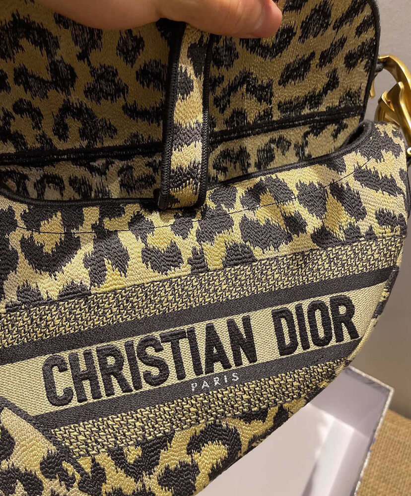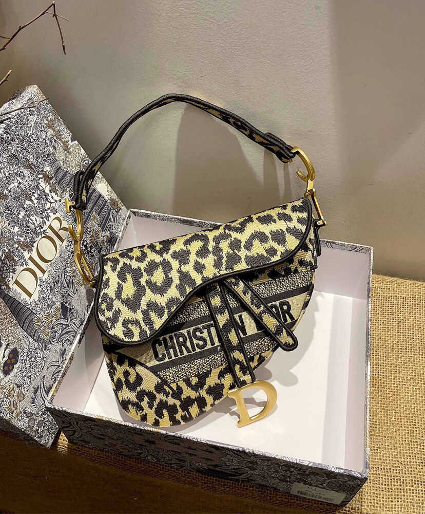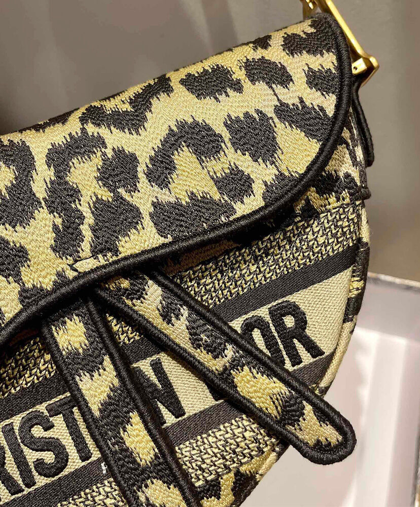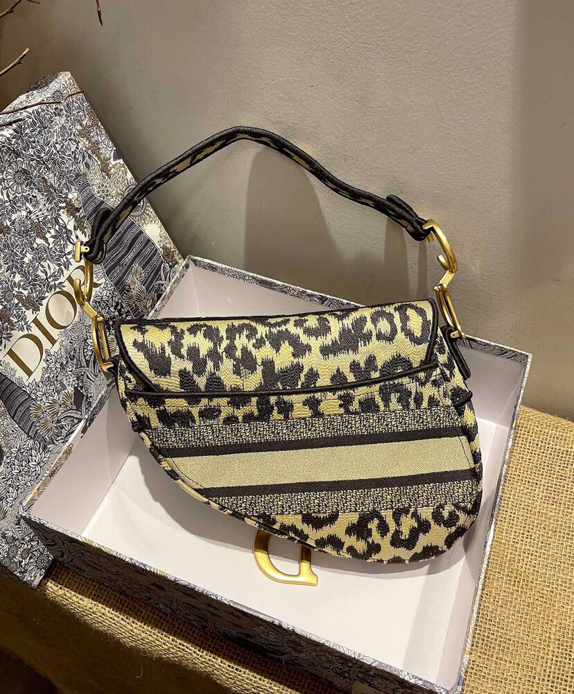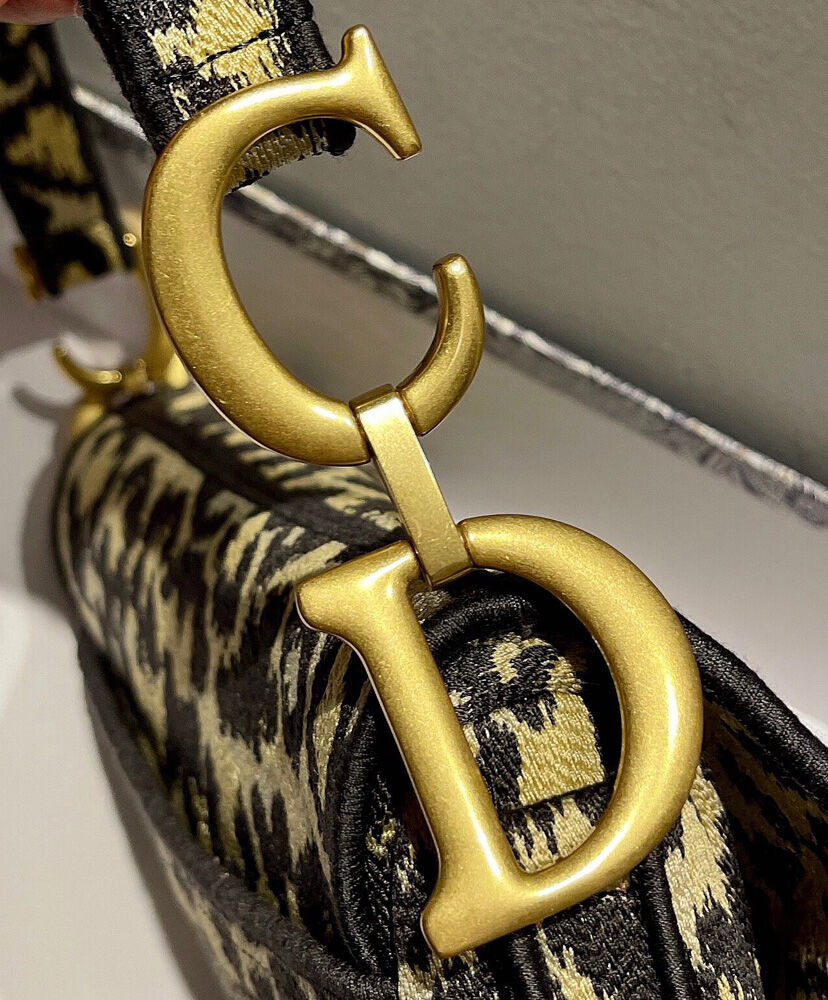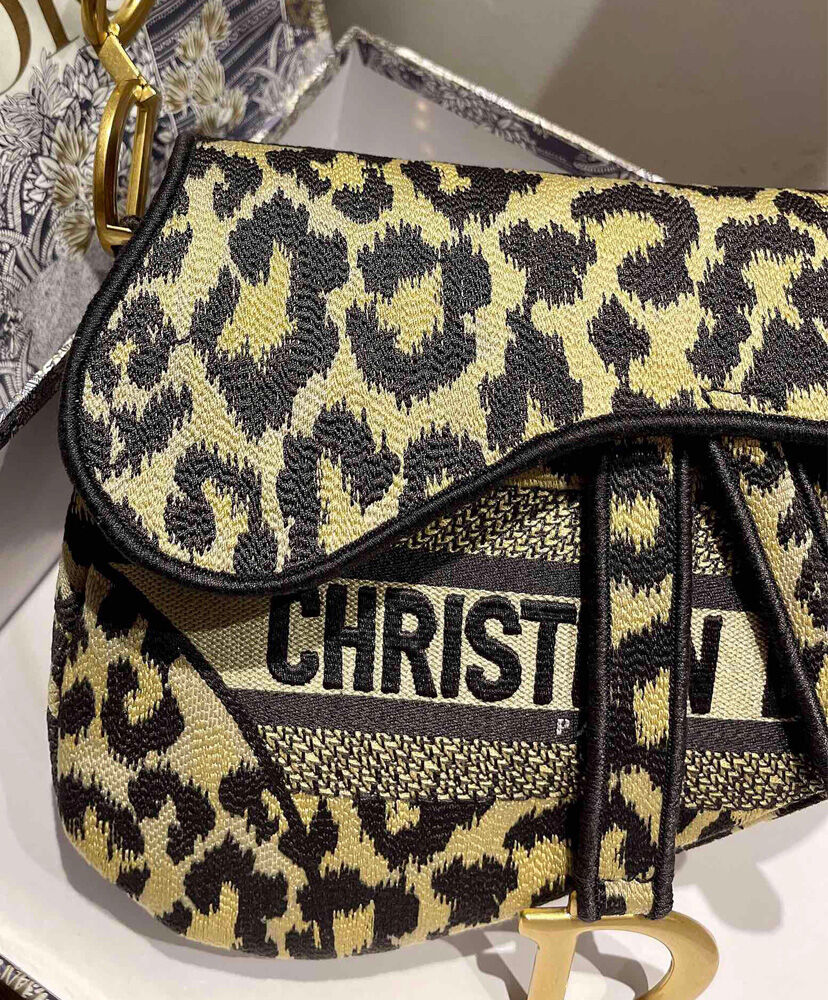 Maria Grazia Chiuri brings a fresh update to the iconic Saddle bag. The design is fully embroidered with the beige multicolor Mizza motif, inspired by a leopard pattern from the House archives. The legendary style features a Saddle flap with a magnetic ‘D’ stirrup clasp and boasts an antique gold-finish metal ‘CD’ signature on each side of the handle. The bag can be carried by hand or worn over the shoulder and may be customized with different shoulder straps.