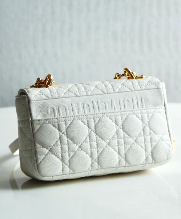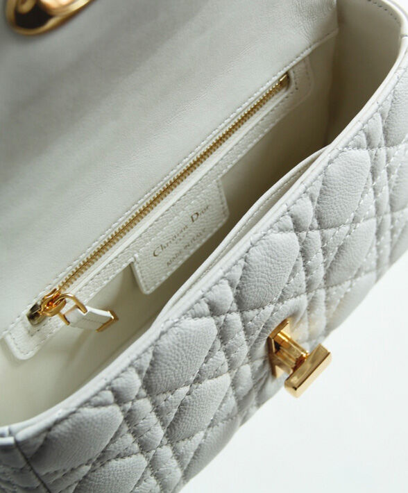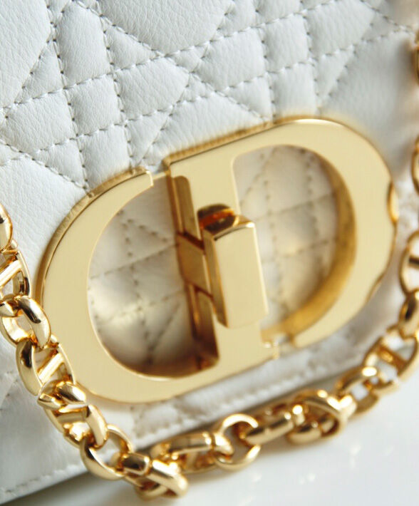 The new Dior Caro bag boasts Cannage stitching on soft calfskin, showcasing the instantly recognizable quilted texture. The supple bag features a flap with the twist ‘CD’ clasp, inspired by the seal of a Christian Dior perfume bottle, styled in antique gold-finish metal. The removable signature ‘CD’ chain link shoulder strap can be replaced with a wide embroidered strap, allowing the small style to be worn during both the day and the evening in a modern, elegant look.