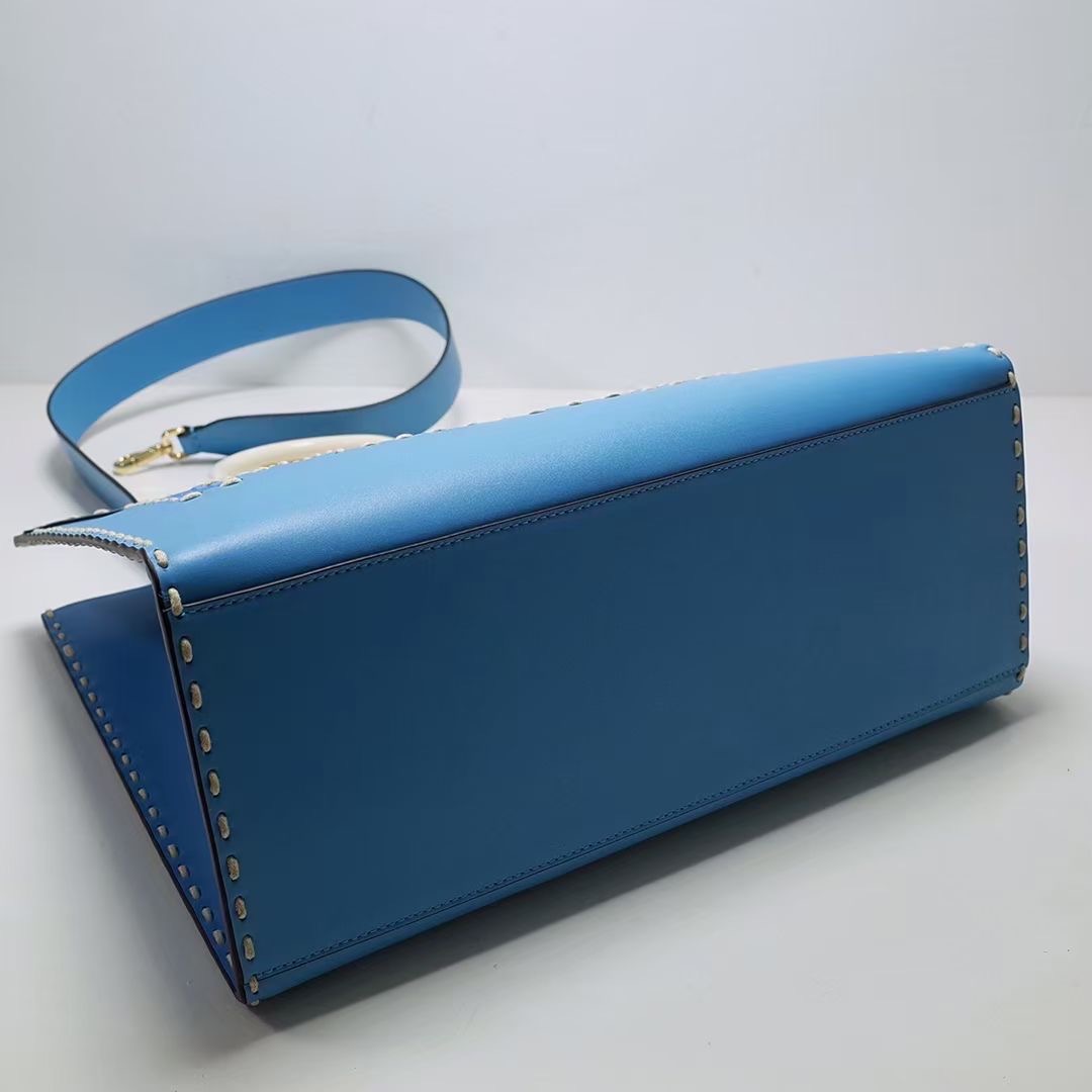 Medium Sunshine Shopper bag made from blue leather with hot-stamped “FENDI ROMA” and stiff tortoiseshell plexiglass handles.