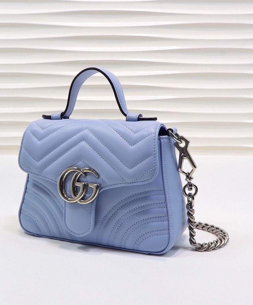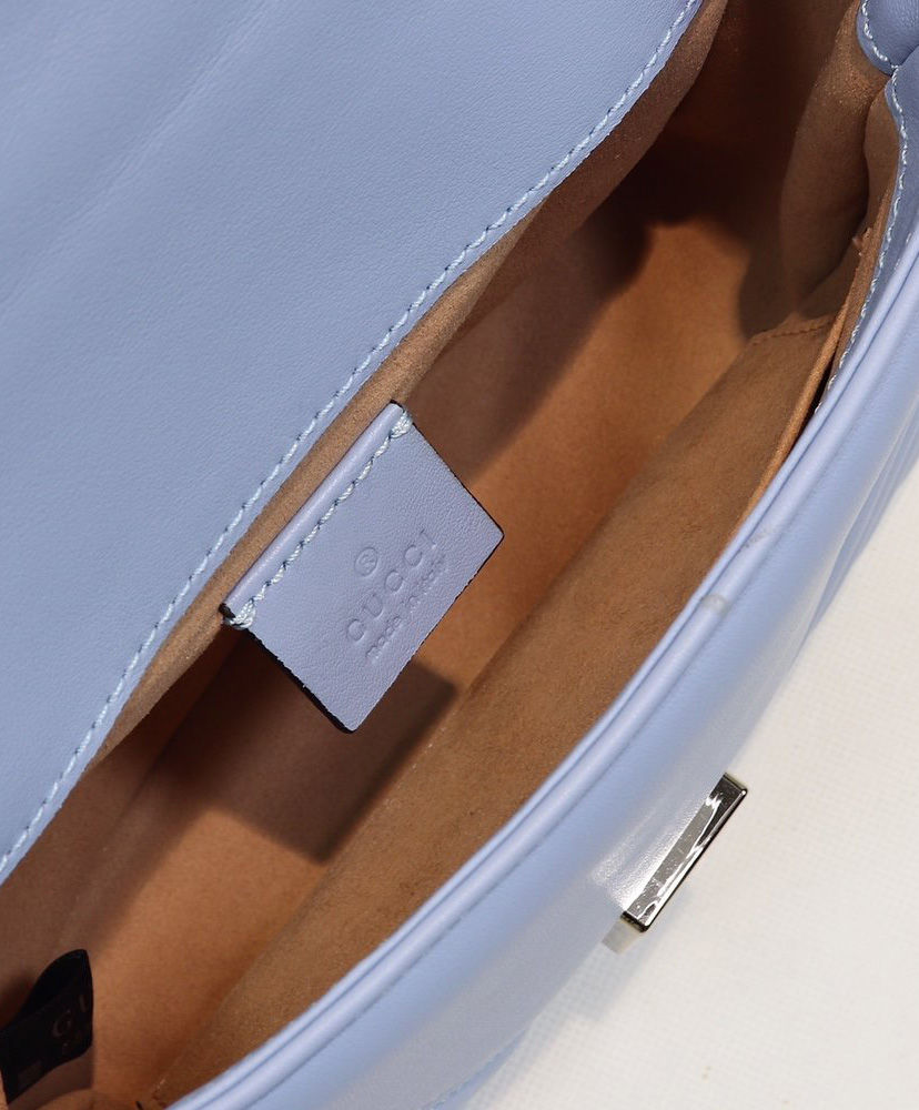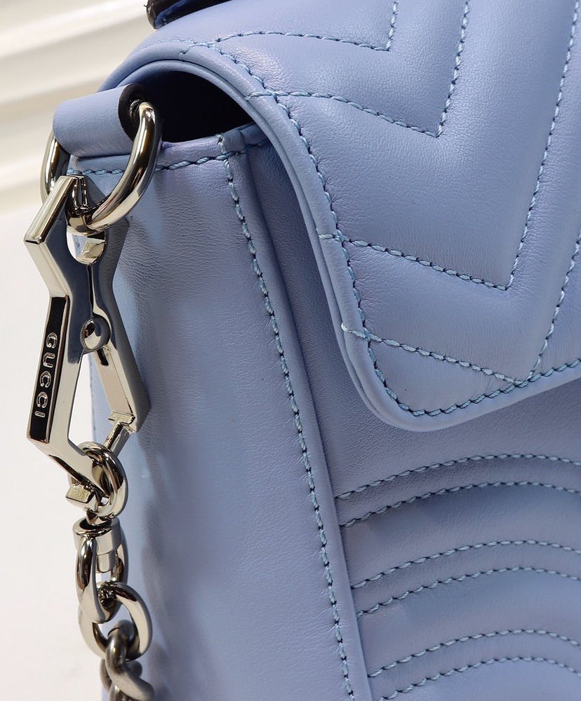 Presented in a light blue shade, the mini GG Marmont top handle bag has a softly structured shape and a flap closure with Double G hardware. The bag is equipped with a leather top handle and chain shoulder strap for added comfort and multifunctional use. Made in matelassé chevron leather with a heart on the back, pastels push the color focus throughout the Pre-Fall 2020 collection, in soft, vibrant hues.