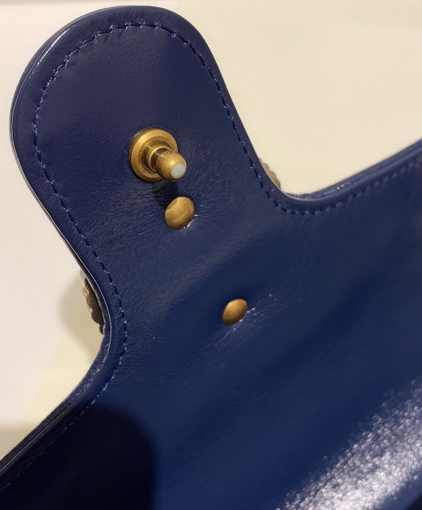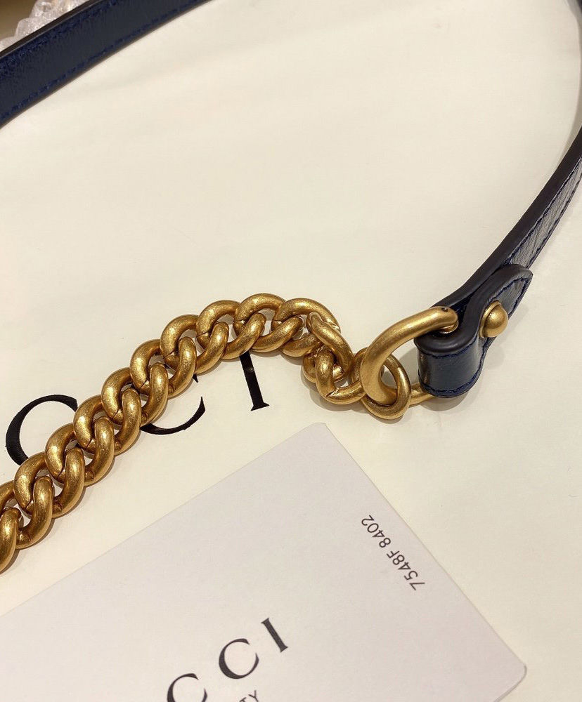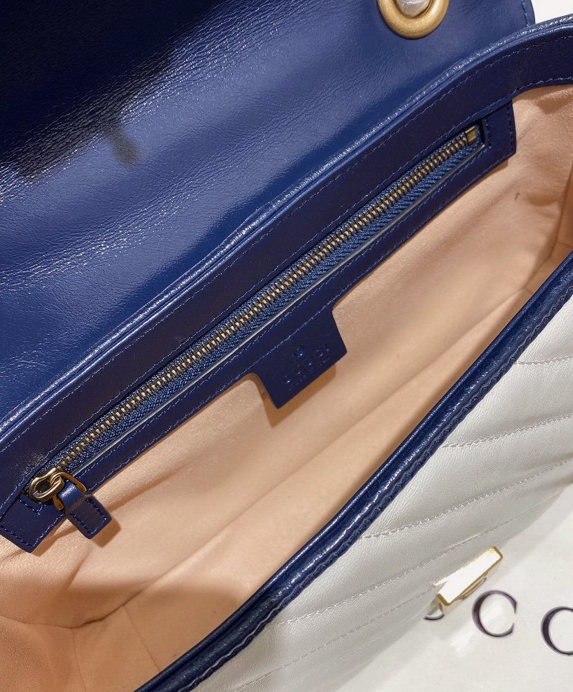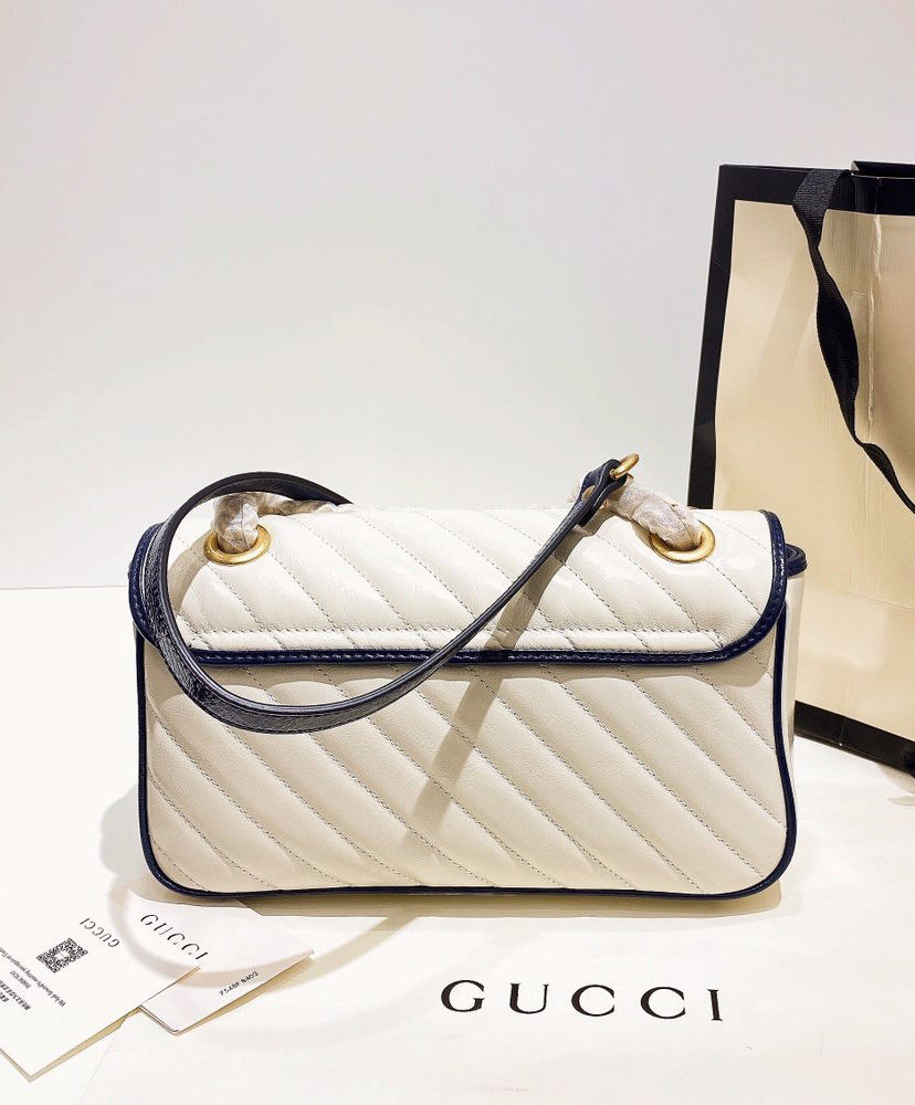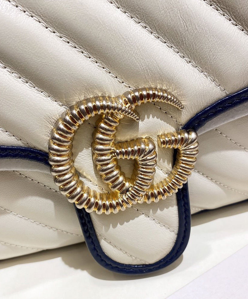 The GG Marmont bag is introduced in white diagonal matelassé quilted leather for Pre-Fall 2020, completed with a twisted torchon Double G embellishment. The small chain shoulder bag’s distinct softly structured shape is outlined in contrast dark blue piping, highlighting its flap closure. The sliding chain strap smoothly transforms from a single shoulder length to a doubled top handle length for multiple ways to wear the bag.