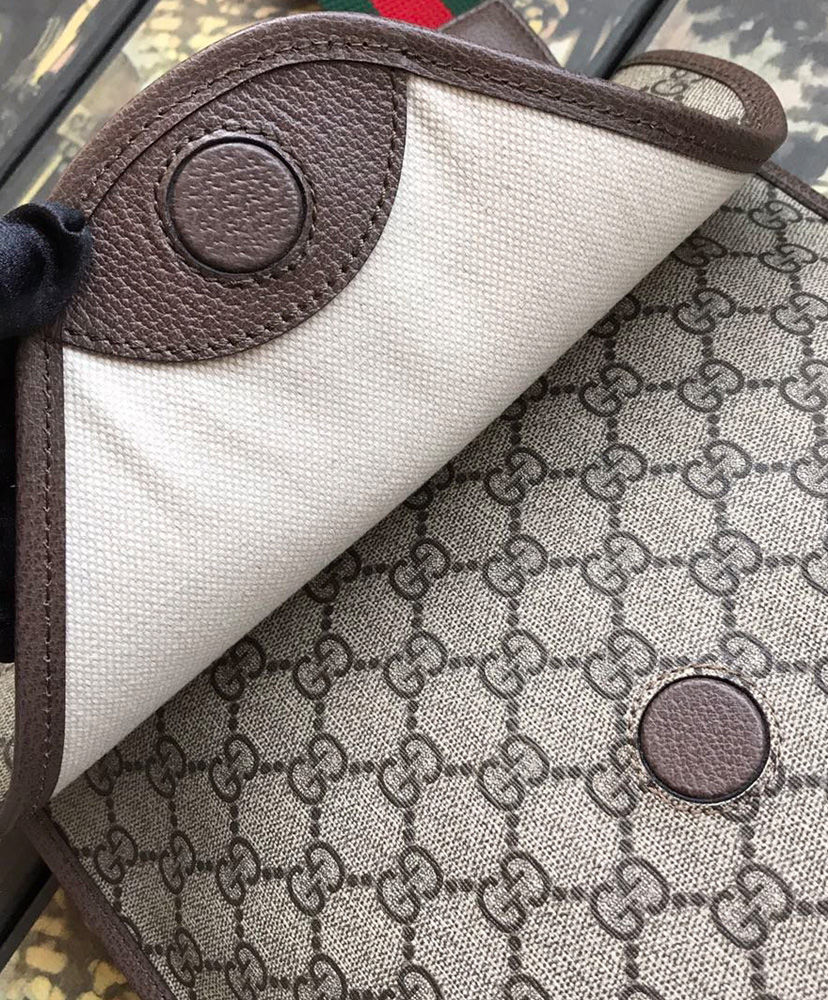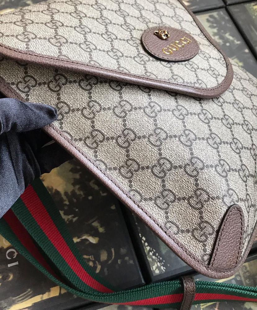 The medium messenger bag is part of a collection of vintage inspired leather accessories in GG Supreme featuring an oval leather tag with metal feline head, a now-established code of the House. The slim design has a magnetic flap closure and is completed with an adjustable nylon strap featuring the House Web colors.