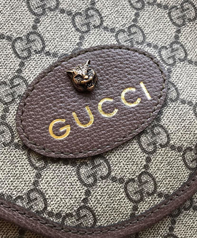 Oval Gucci leather tag with feline head