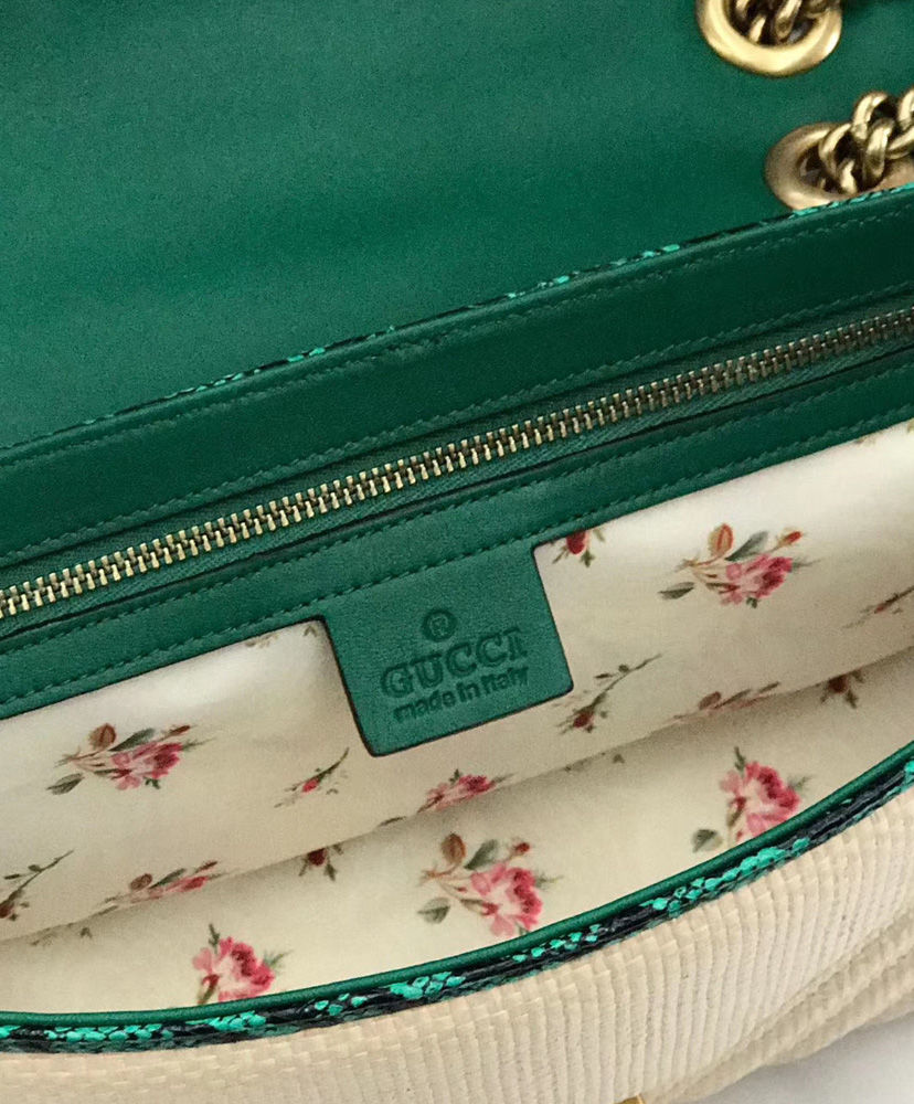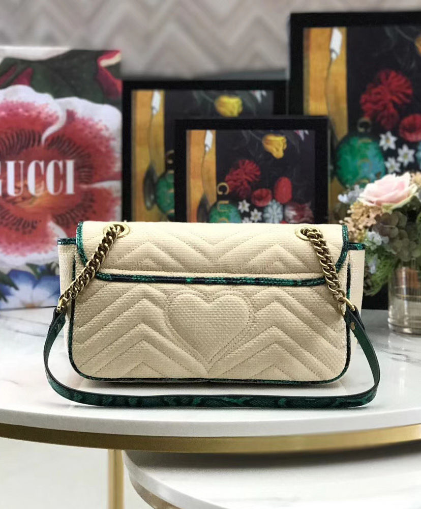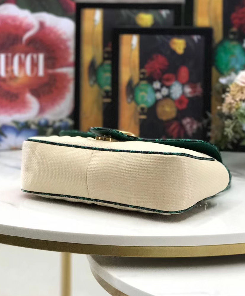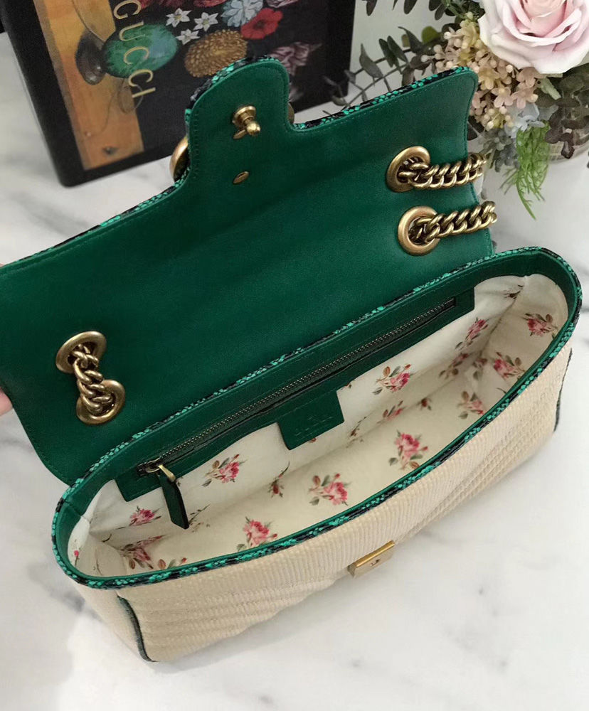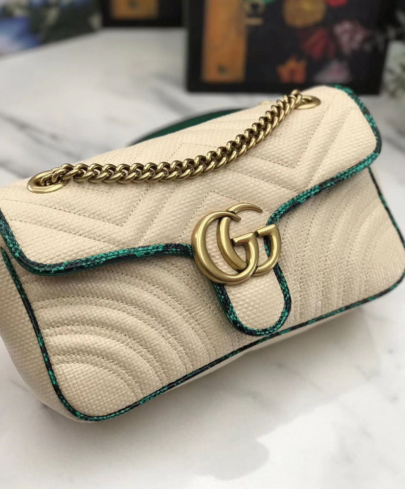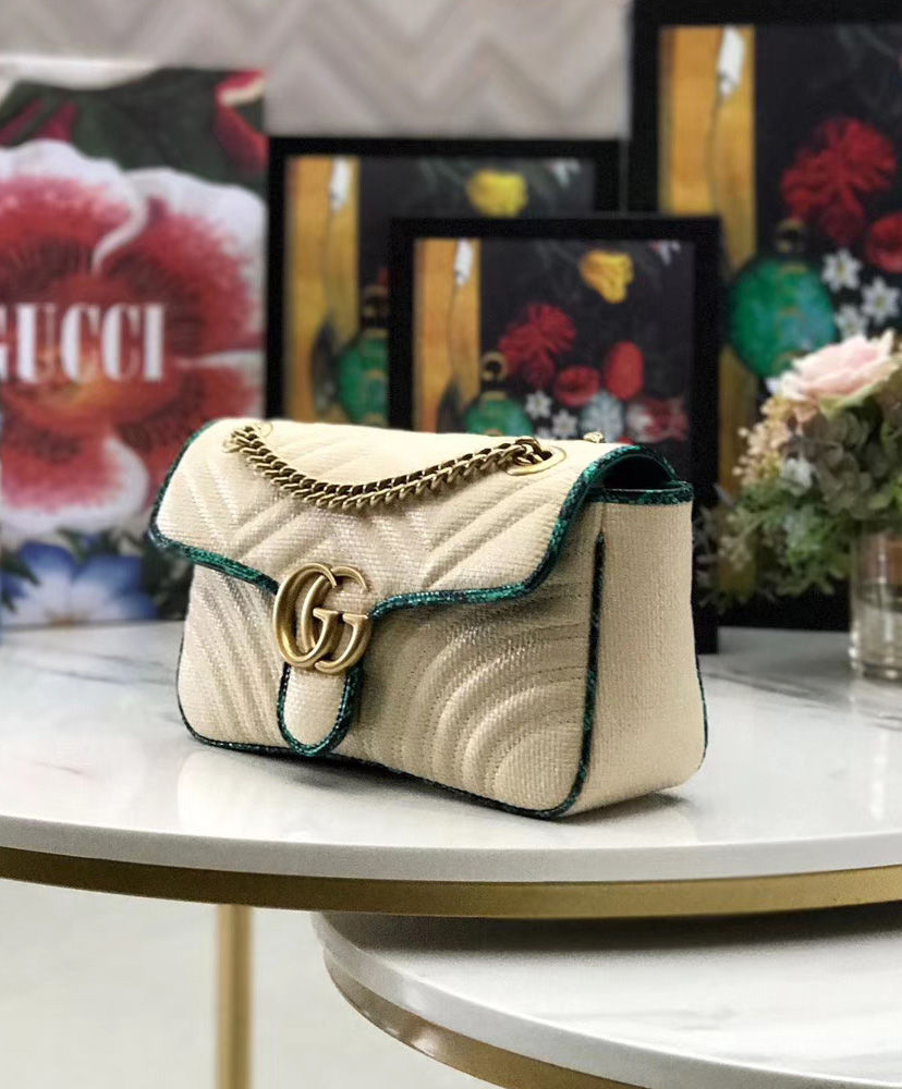 The distinctive GG Marmont line is enriched for Pre-Fall 2019 with a new iteration in raffia with vivid-toned snakeskin trim. The coveted silhouette is defined by the line’s signature matelasse chevron design with a heart at the back and Double G closure. New shapes and signature Gucci lines are reimagined in a mix of fabrics and trims imbued with an inherently summer feel.