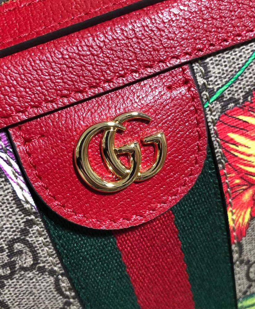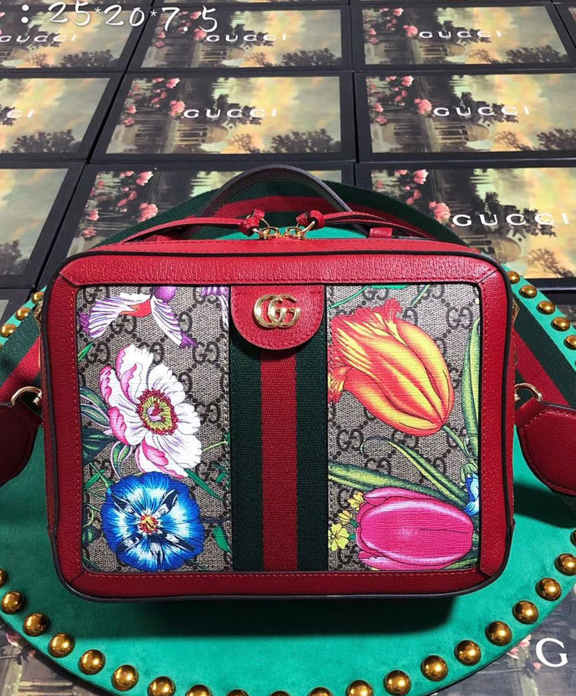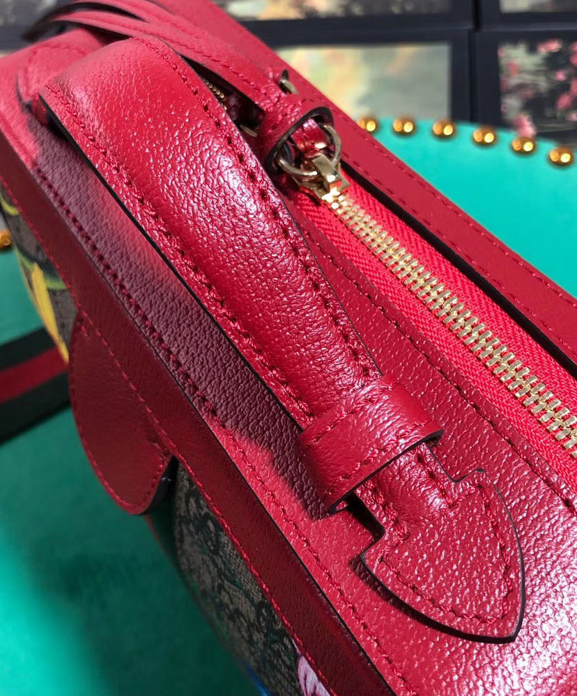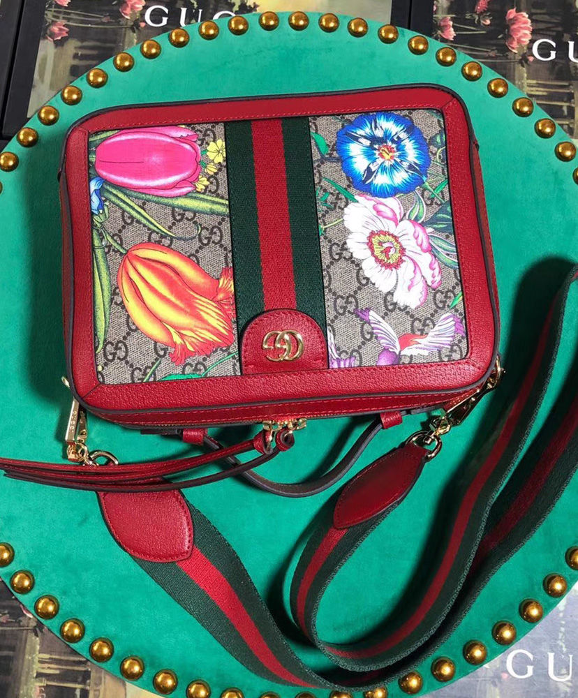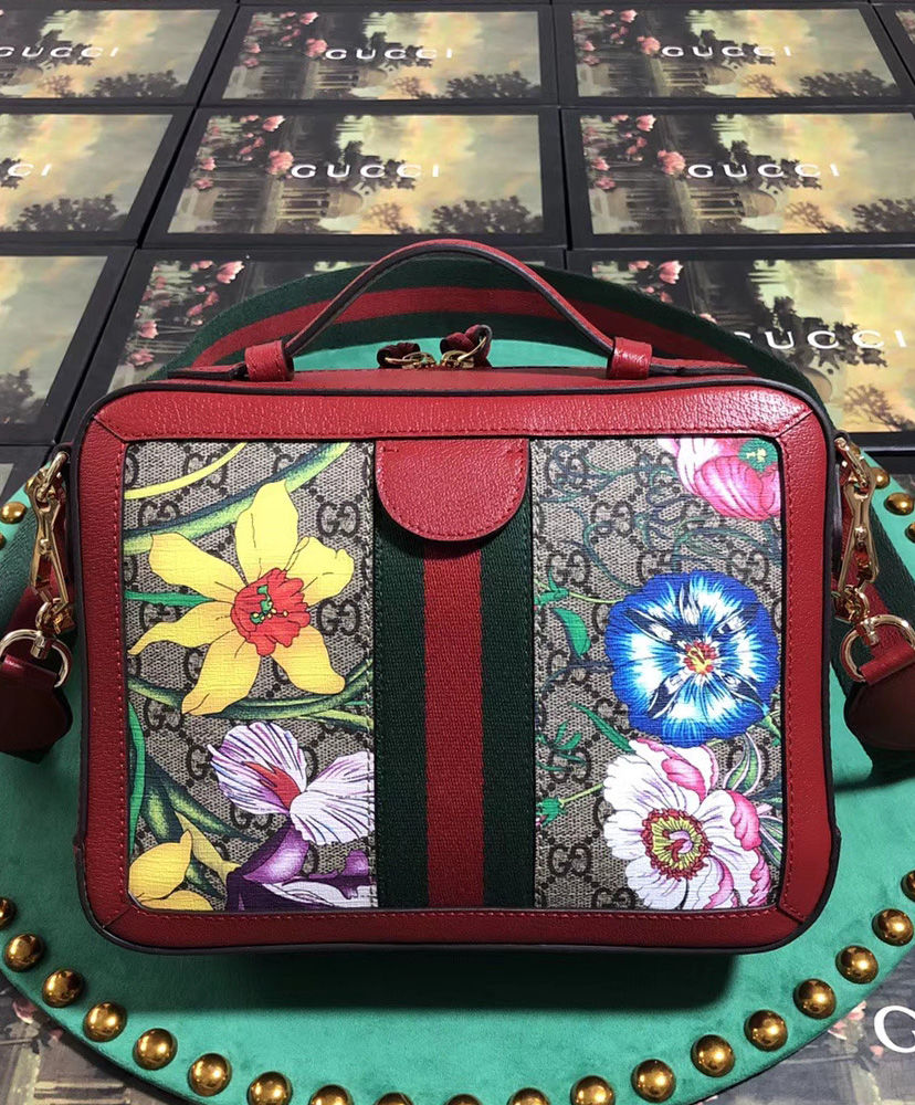 GG Supreme canvas with Flora print, a material with low environmental impact, with red leather trim