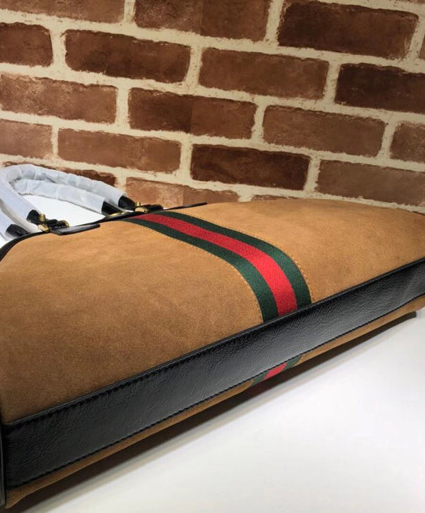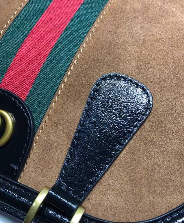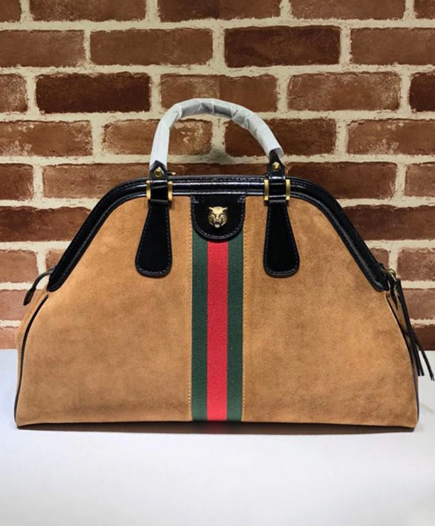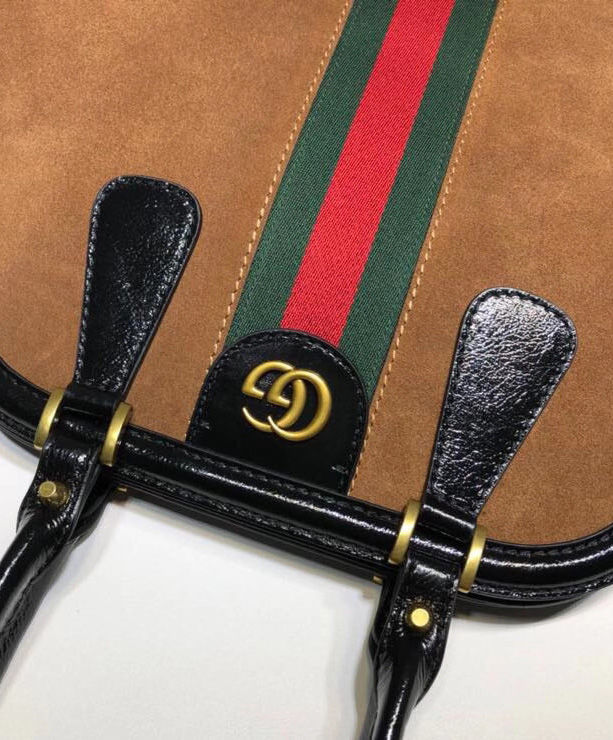 A soft construction with a framed design defines the top handle bag, crafted from suede with patent leather trims. Subtle references to the House further enrich the sides of the bag. The Double G an archival reprisal of the House’s signature emblem embellishes one side while the other portrays the feline head. Elongated handles allow the bag to be worn as a shoulder bag as well as a top handle.