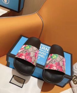 A floral slide sandal in our GG Blooms supreme canvas with a molded rubber footbed.