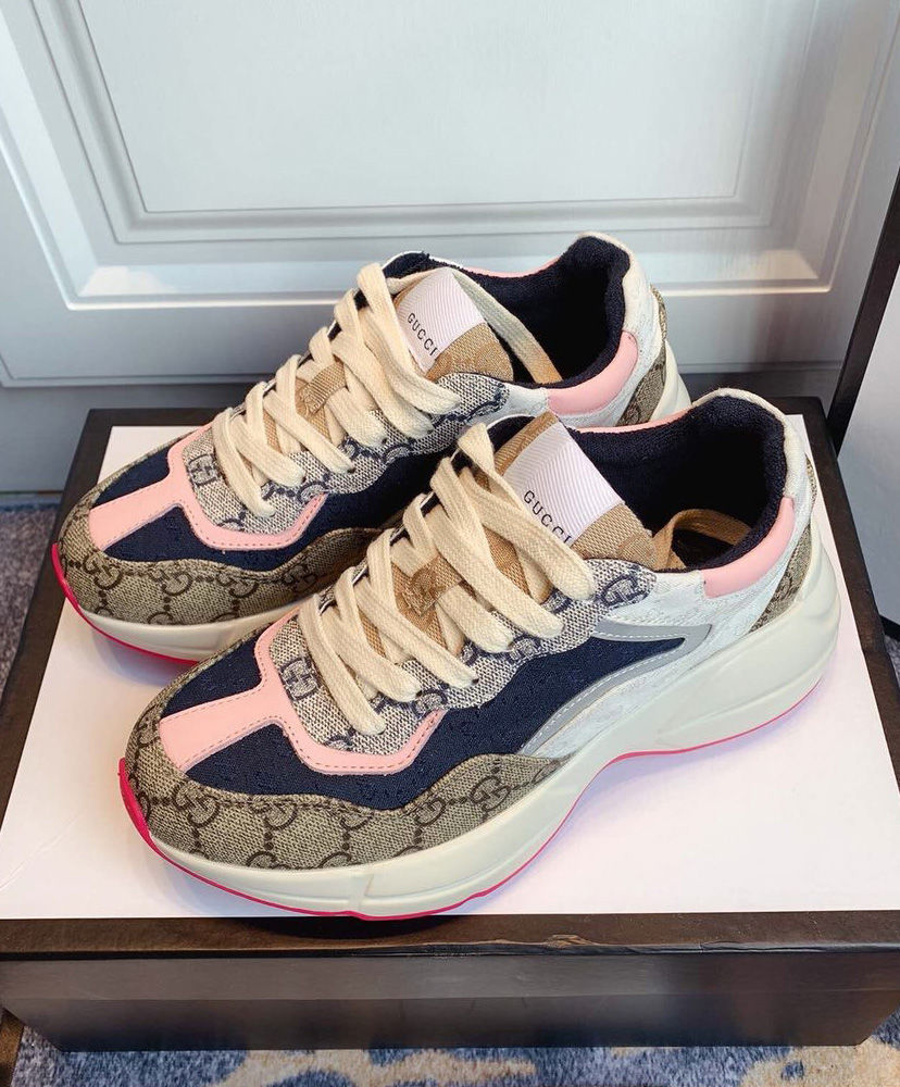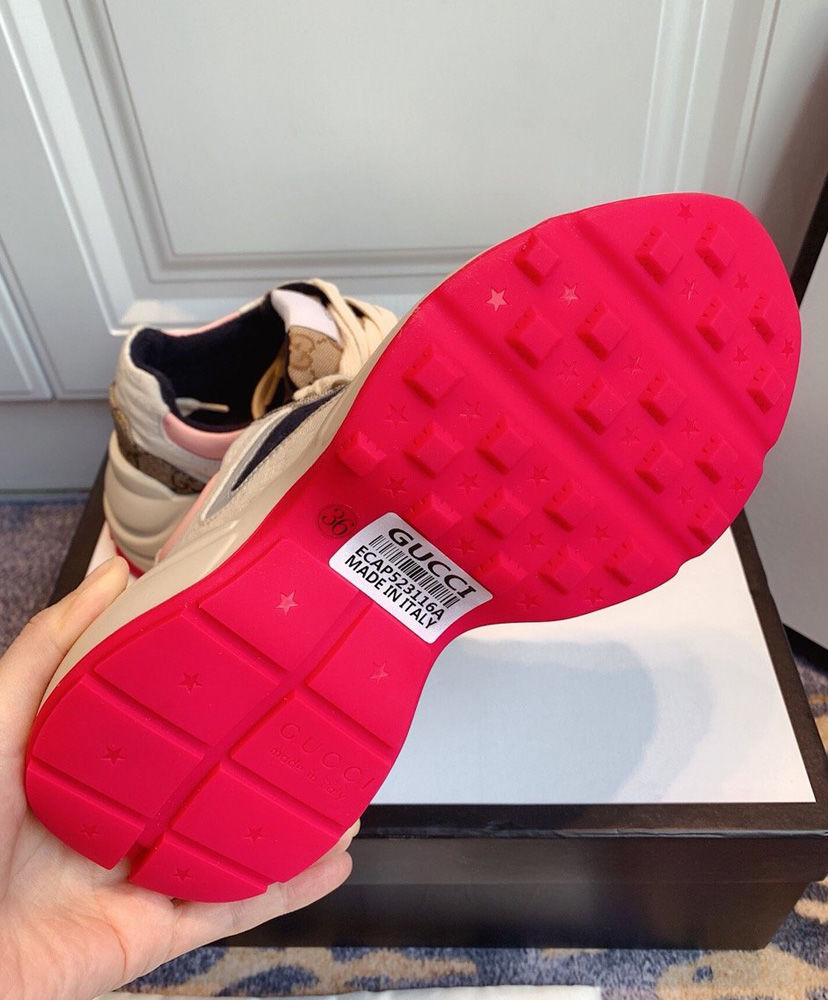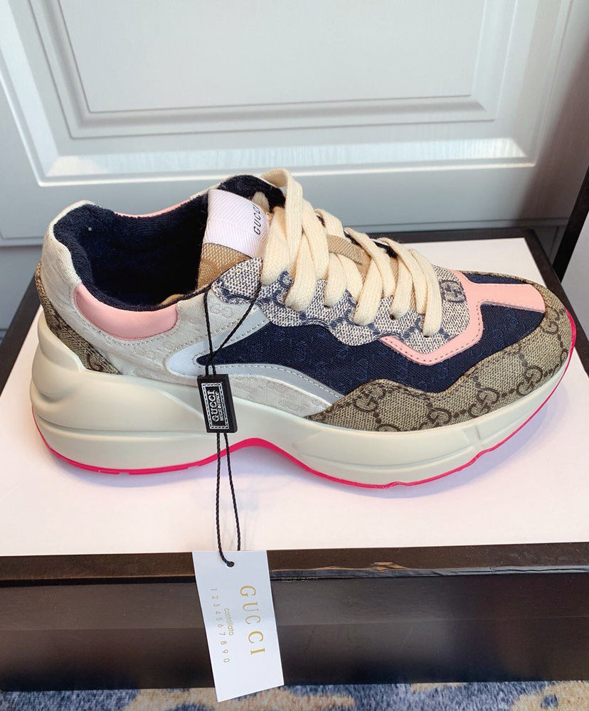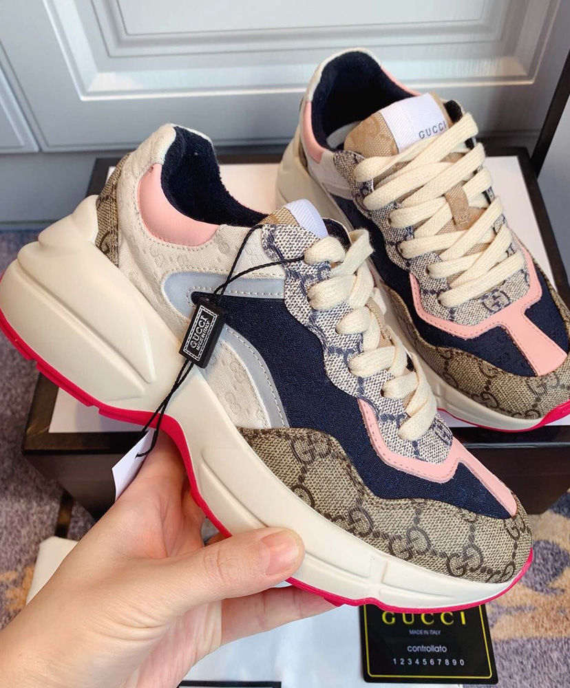The House’s emblematic sneaker is revisited as part of the Spring Summer 2020 collection where styles work together to create a language of self-expression. Defined by a thick sole and chunky construction, the Rhyton is presented in a mix of monogram fabrics and trimmed in leather and reflective material. Archival fabrics are reimagined through Gucci’s hybrid design narrative. On top of this shoe, GG Supreme is combined with a mini version in contrasting colors and with Original GG canvas for a retro logomania approach.