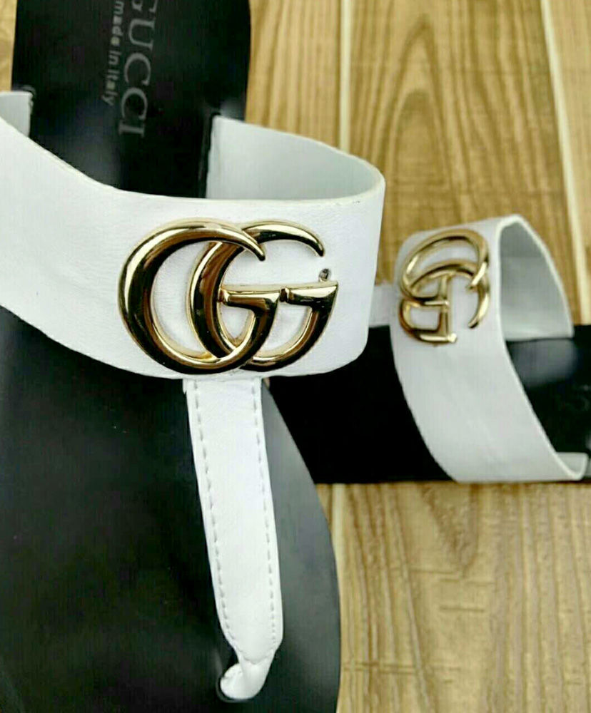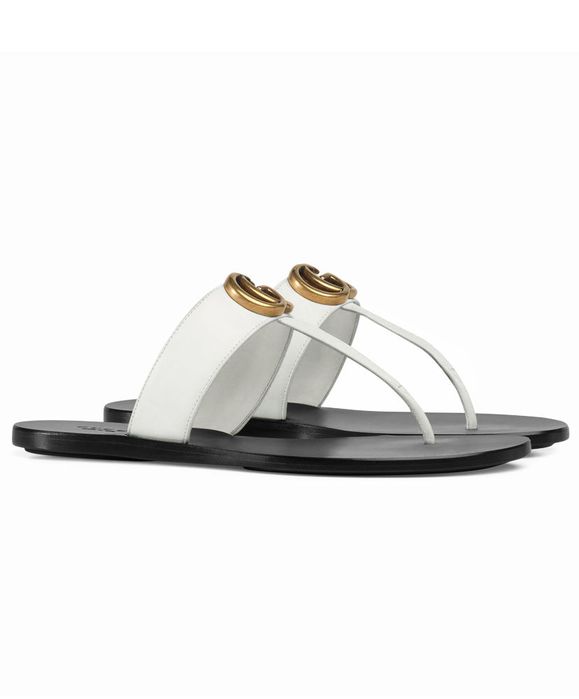 The leather thong sandal is embellished with the Double G hardware—an archival design from the ’70s.