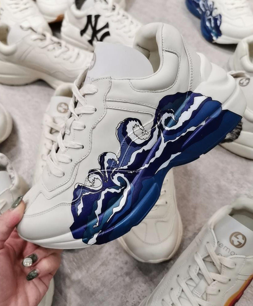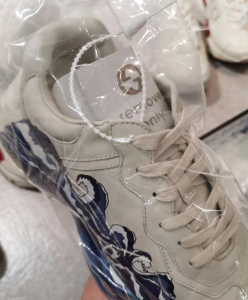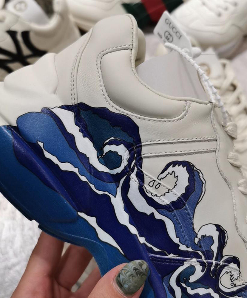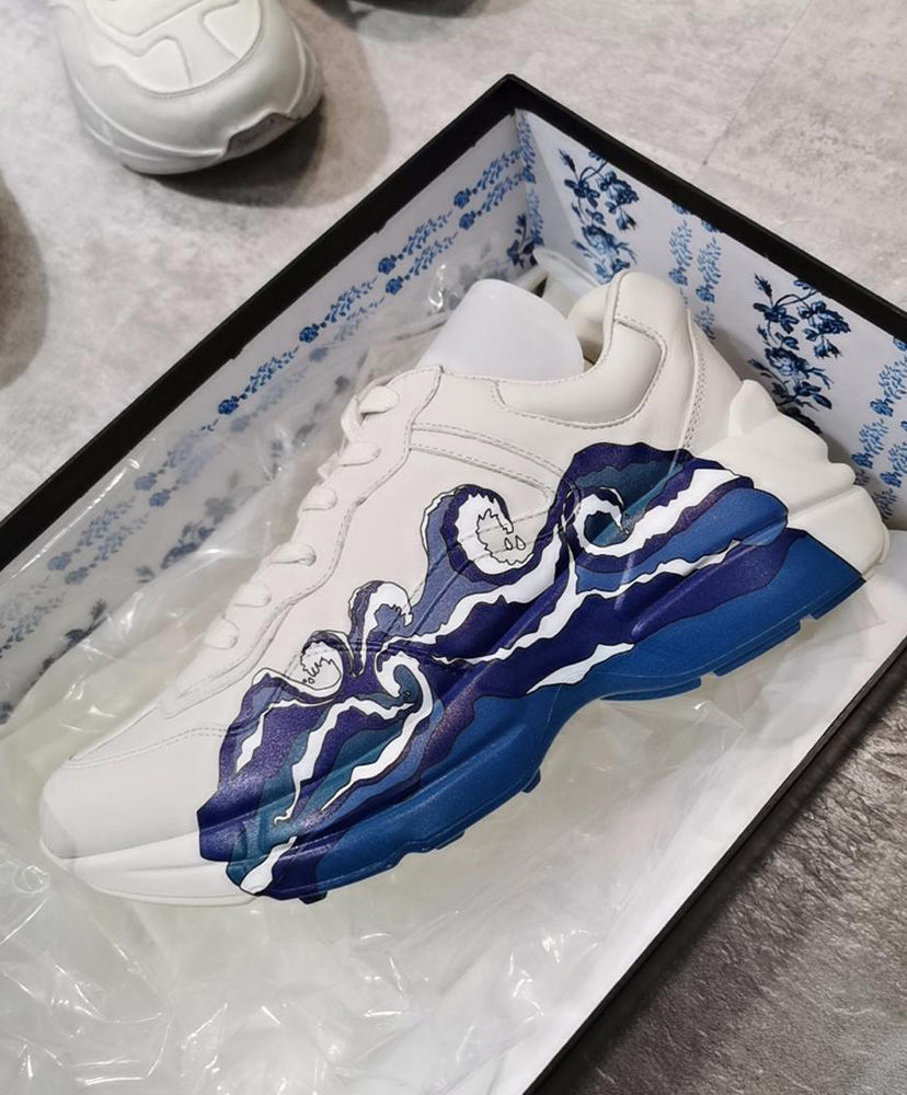 The old school chunky soled design of the Rhyton sneaker is presented in ivory leather for Pre-Fall 2019, printed with a graphic wave print that outlines the side of the shoe.