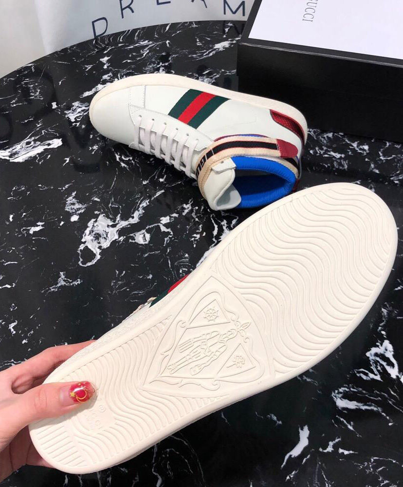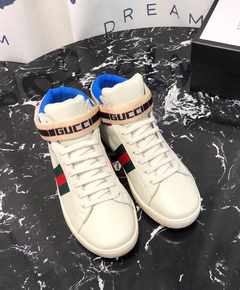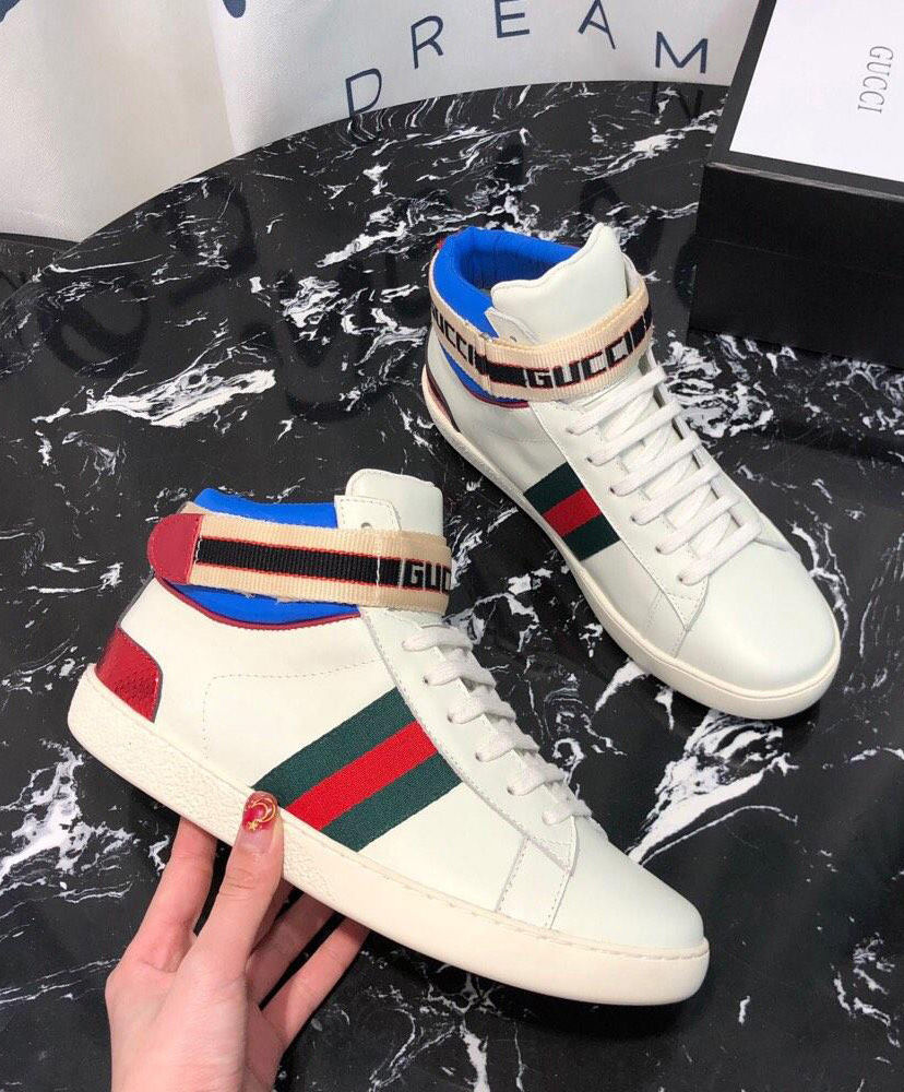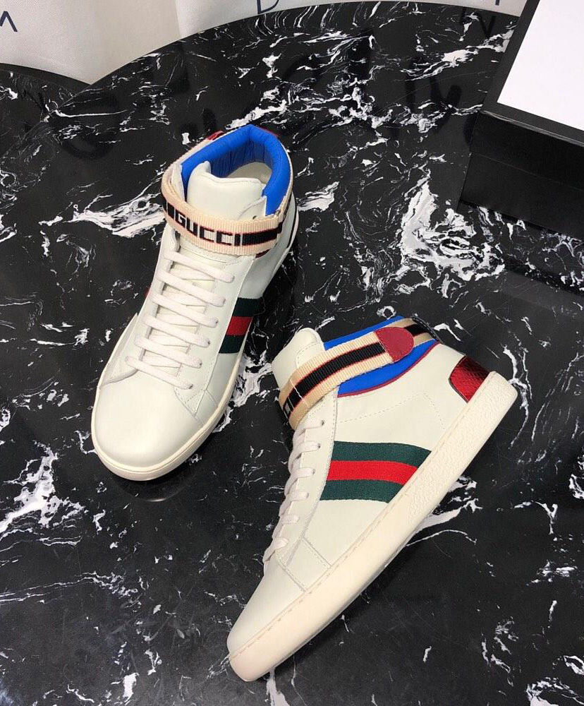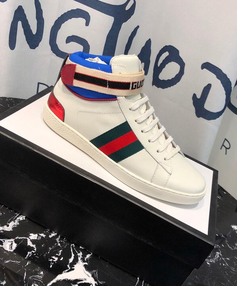 Originally influenced by the tape logos running down the sides of ’80s tracksuits, the Gucci jacquard stripe has been repurposed in several variations, appearing throughout ready-to-wear and accessories. For Pre-Fall 2018, the sporty motif is presented on a velcro strap in this Ace high-top sneaker, crafted in black leather with a green nylon trim.