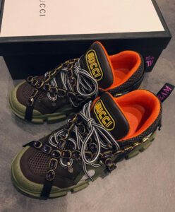 Multicolor crystals are embroidered onto a removable elastic strap, wrapping around the sneakers and resulting in a kaleidoscope effect. Inspired by the hiking world, this shoe line combines an oversize design with dream-like details. Featuring a vibrant mix of metallic leathers in different colors, the accessory is defined by the Gucci patch with the graphic font of SEGA – a fixture in the colorful arcades and coin-op game rooms of the ’80s.