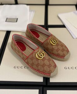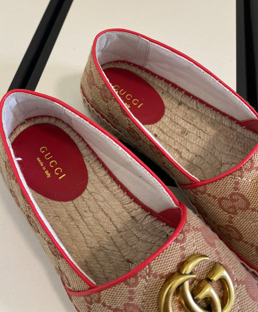 The espadrille is reimagined with a strong logo connotation for Spring Summer 2020. Defined by the archival Double G hardware from the ’70s, the shoe is presented in diagonal matelasse Original GG canvas—a timeless pairing that pays homage to the House’s heritage. A red leather trim adds a colorful twist.