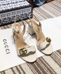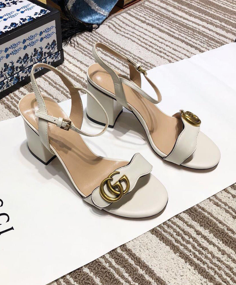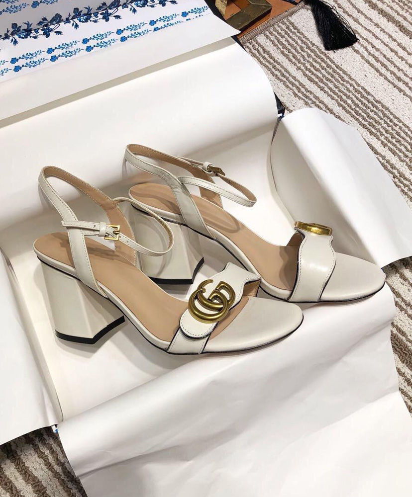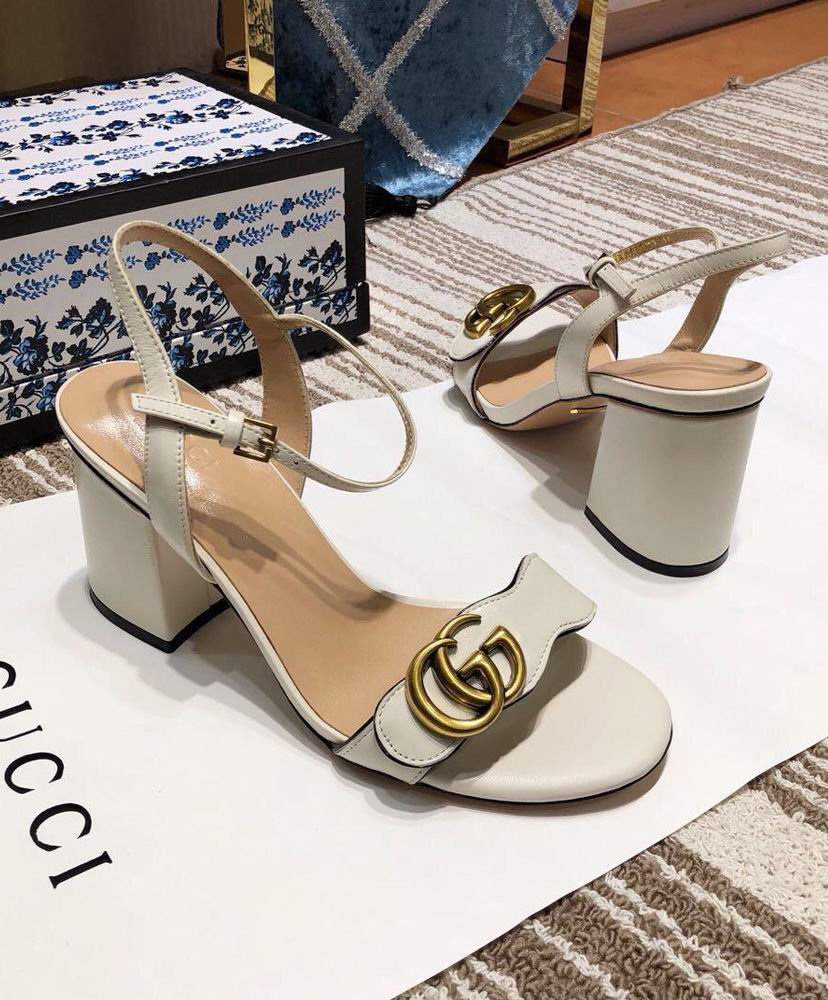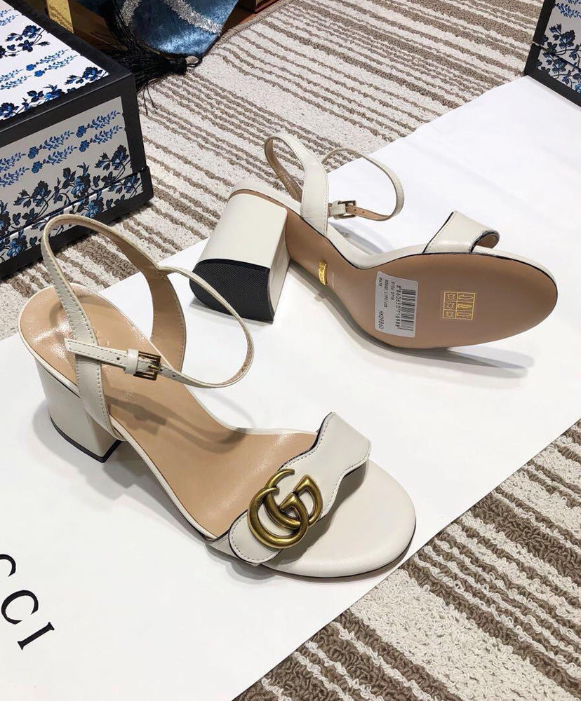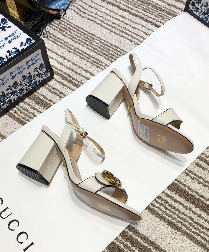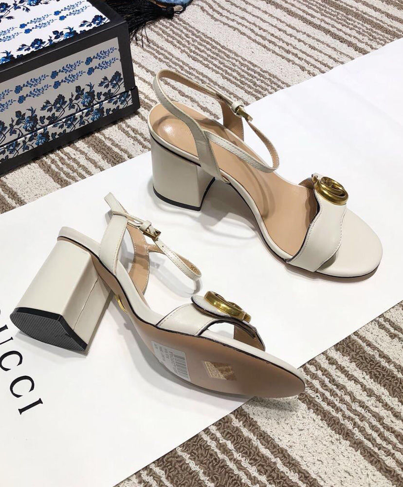 The Double G gold-toned hardware is set on the front strap of these mid-heel leather sandals.