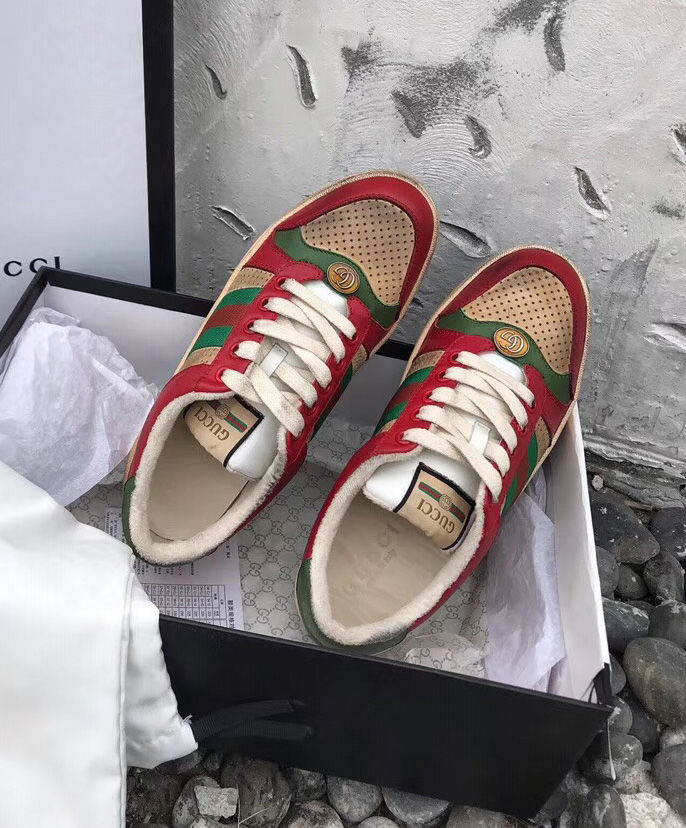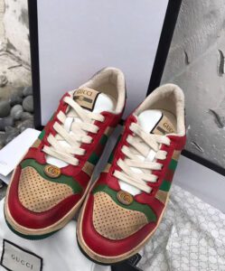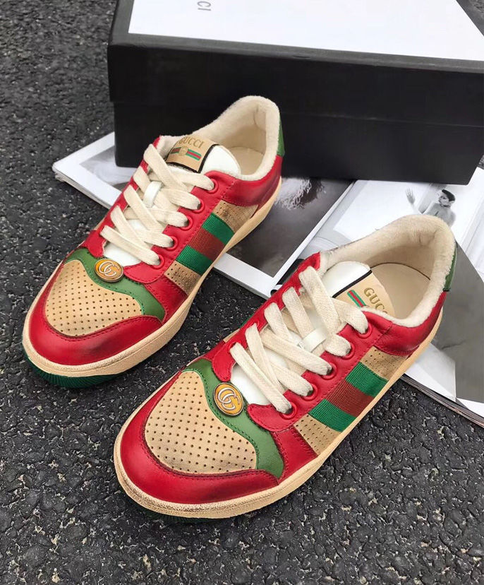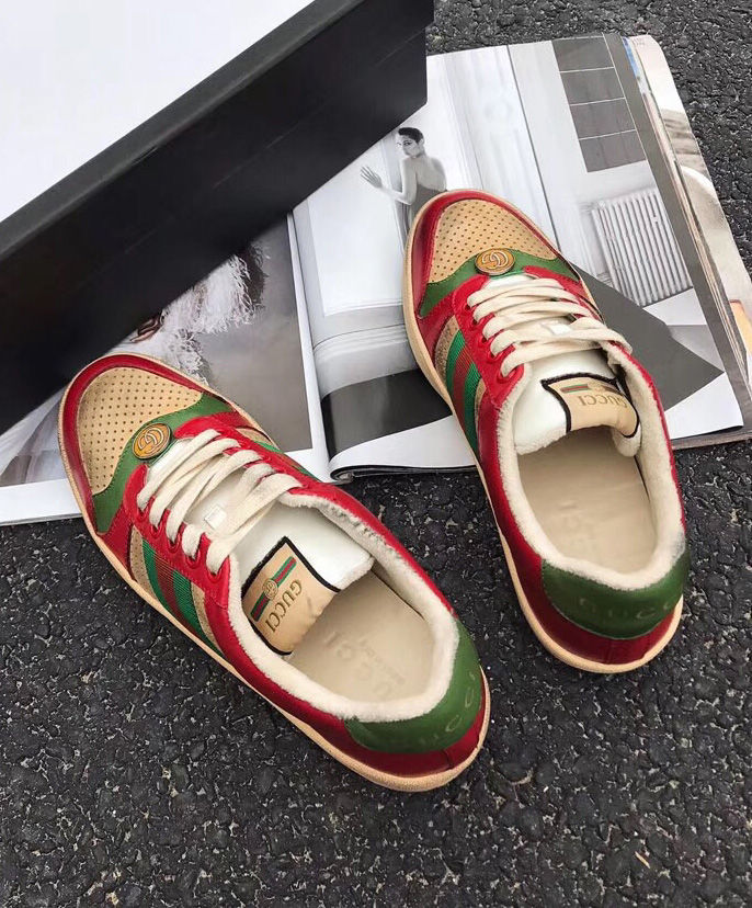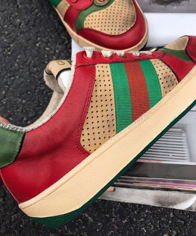 A pastiche of different influences that span across decades, the Cruise 2019 collection references old school shapes and materials inspired by vintage sportswear. Influenced by classic trainers from the ’70s, the multicolor Screener sneakers—named for the defensive sports move—reference the colors of the House Web stripe, treated for an allover distressed effect.