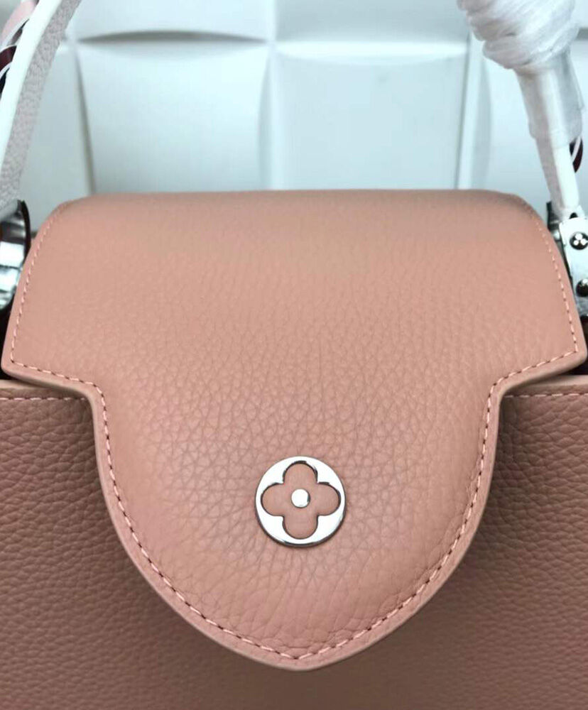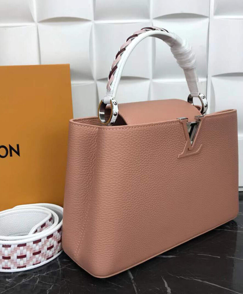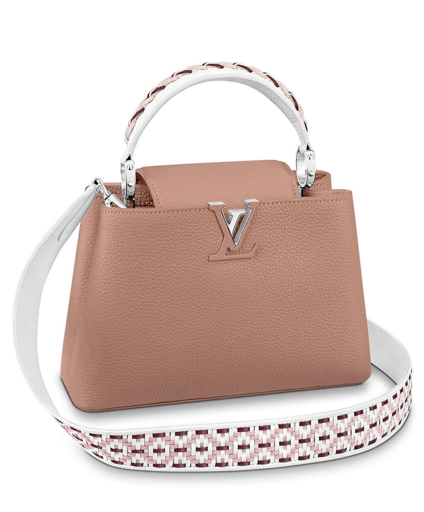 Made from blush pink Taurillon leather, this Capucines BB handbag is finished with an exquisitely braided top handle and wide braided strap. The soft color of the leather body is complemented by the pink, white, and black braided leather of the strap and handle for a delicate and desirable result. The inside zipped pocket inside keeps belongings safe.