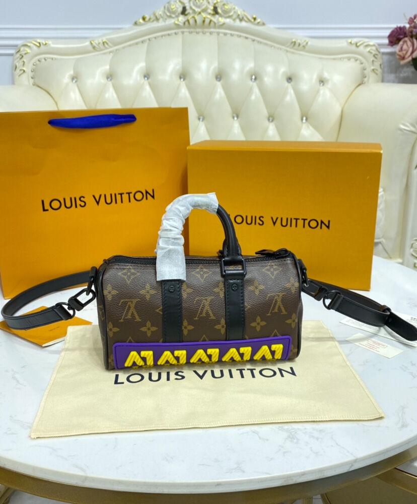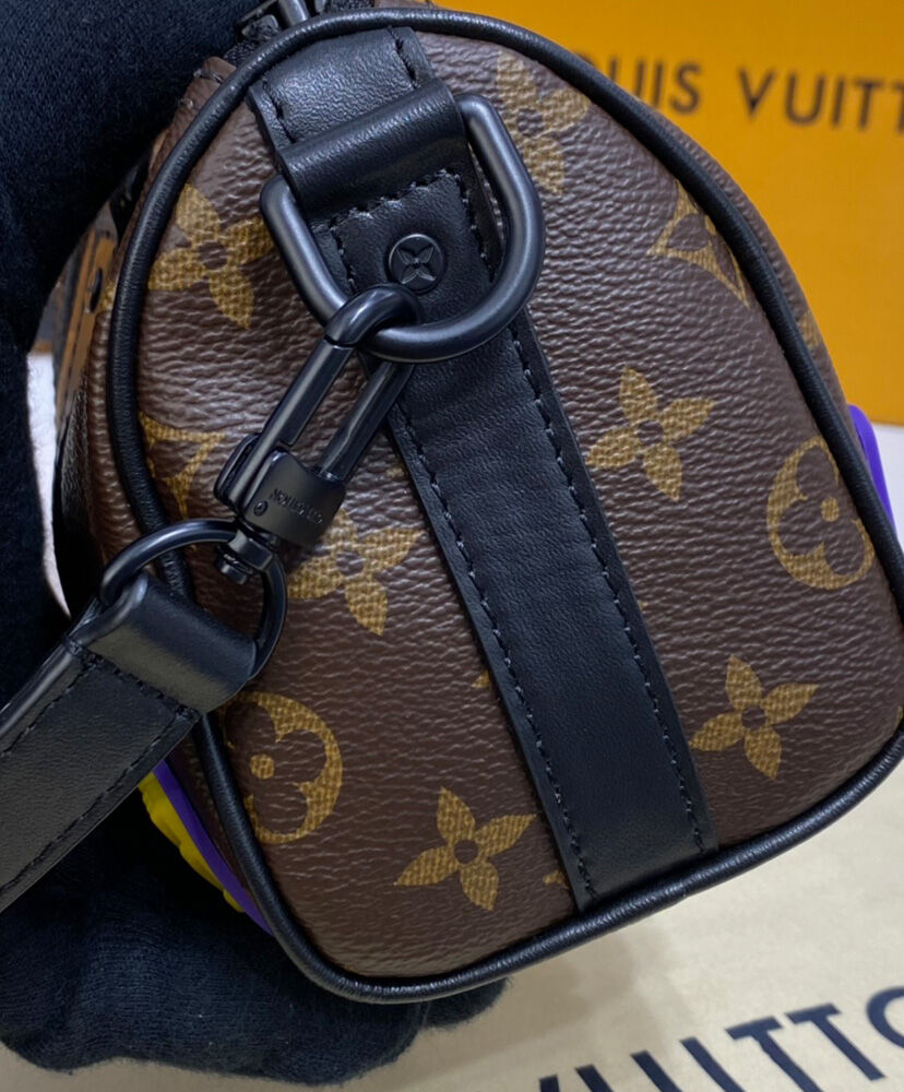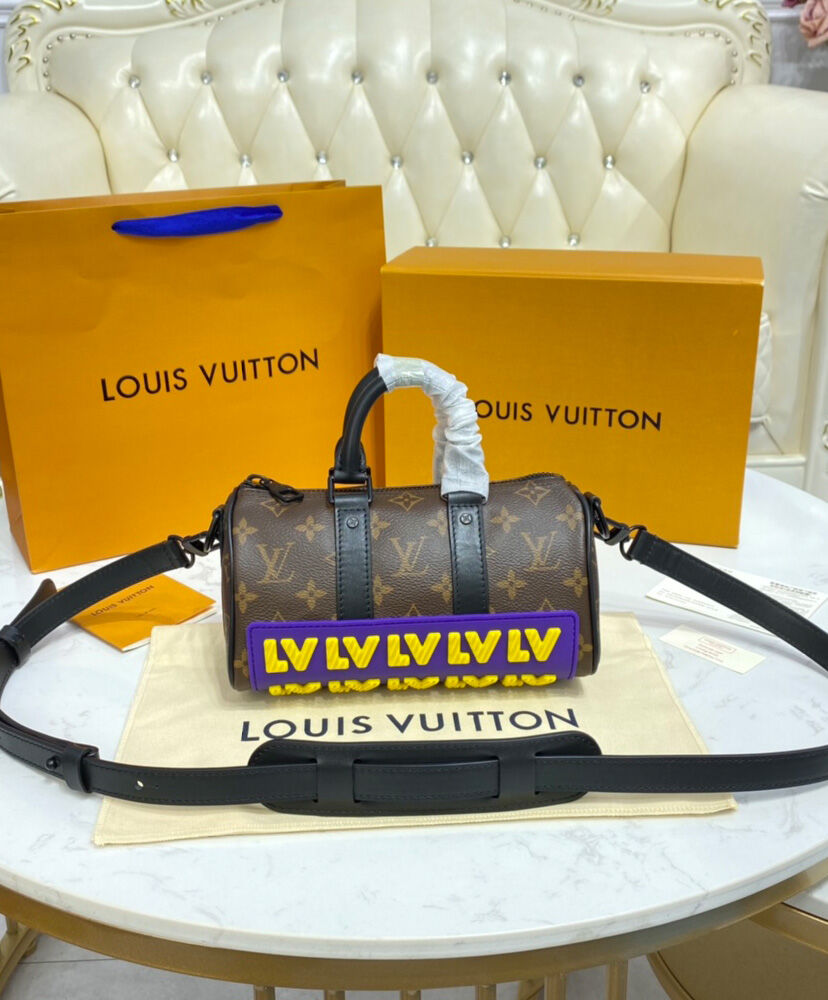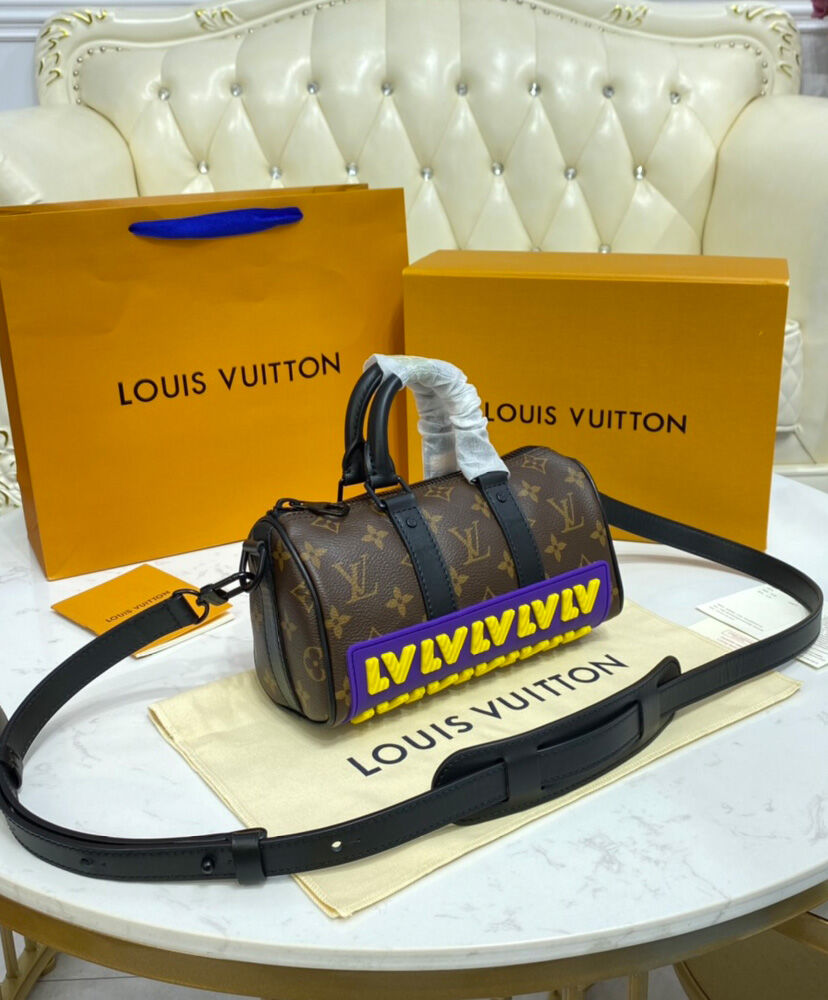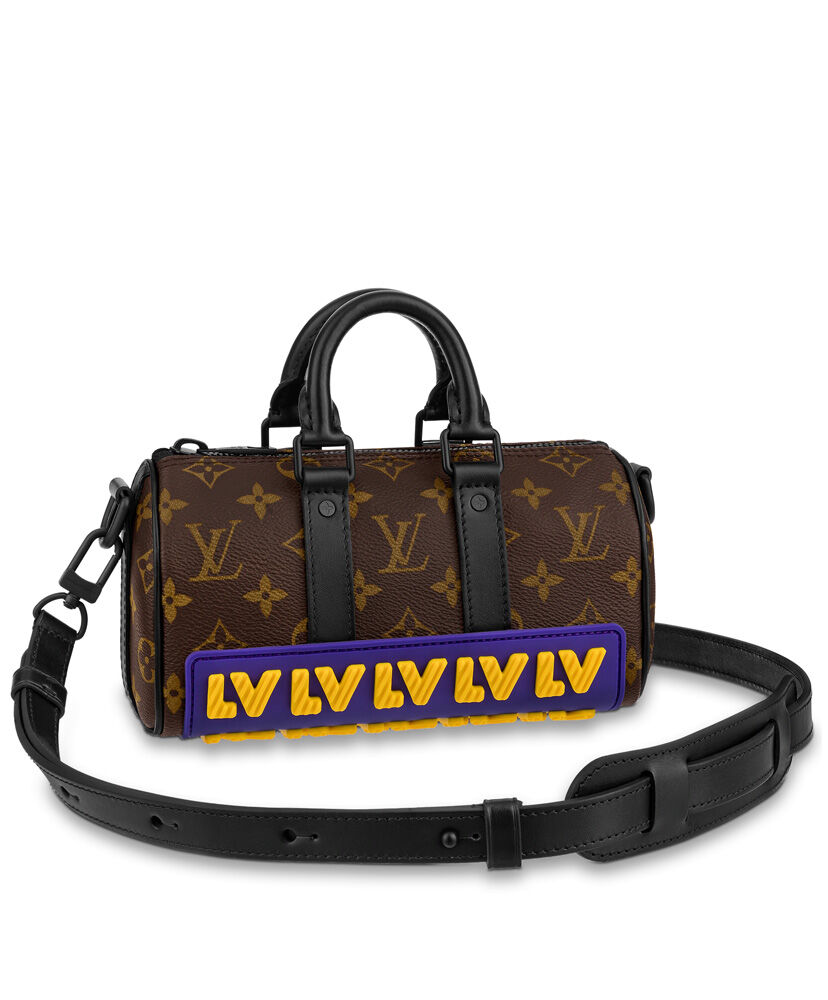The LV Rubber look gives the Keepall XS a bold boost of color and style for fall 2021. Monogram canvas is adorned and protected by a latex applique across the bottom showing the House’s initials in eye-catching yellow and purple. With its double handle and adjustable strap, it’s a practical, easy-to-carry bag that makes a strong signature statement.