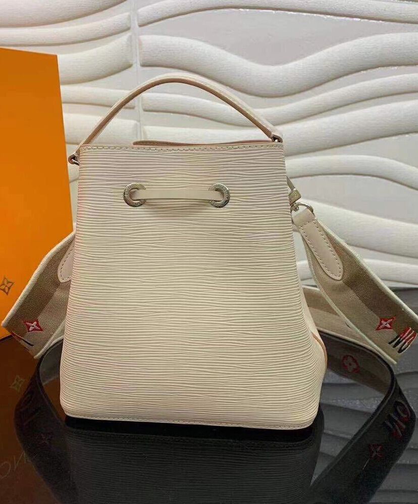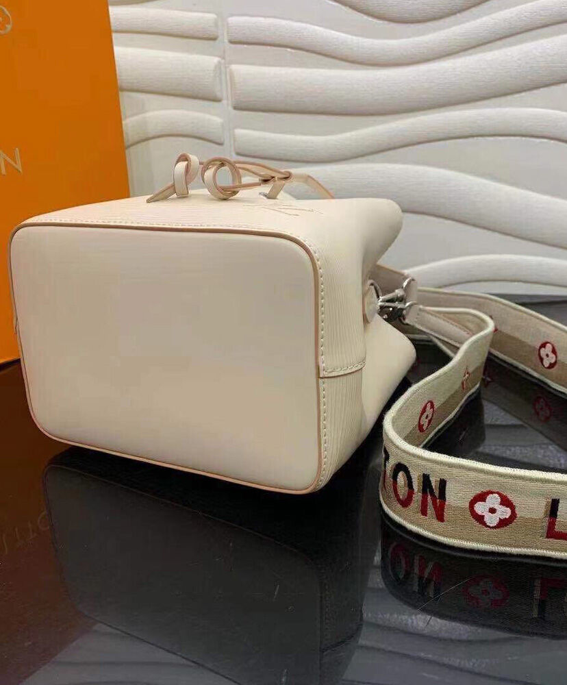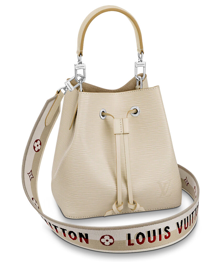 The adorable NeoNoe BB bucket bag now features an embroidered jacquard strap for stylish shoulder carry. The wide removable strap is reversible, featuring Louis Vuitton logos on one side and Monogram Flowers on the other. Made from grained Epi leather, this compact bag has two inside compartments and a central flat pocket that closes with a press stud.