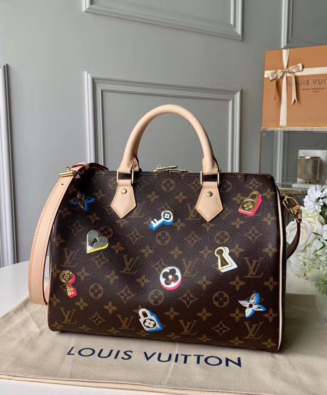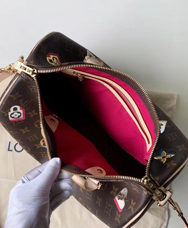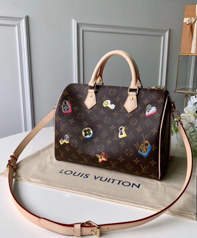 For Spring 2019 the iconic Speedy Bandouliere handbag in Monogram canvas is decorated with the season’s romantic Love Locks motifs. The colorful metallic keys, locks and blossoms evoke House heritage as well as Paris, city of love and home to Louis Vuitton. This collectible Speedy 30 makes a charming gift for Valentine’s Day.