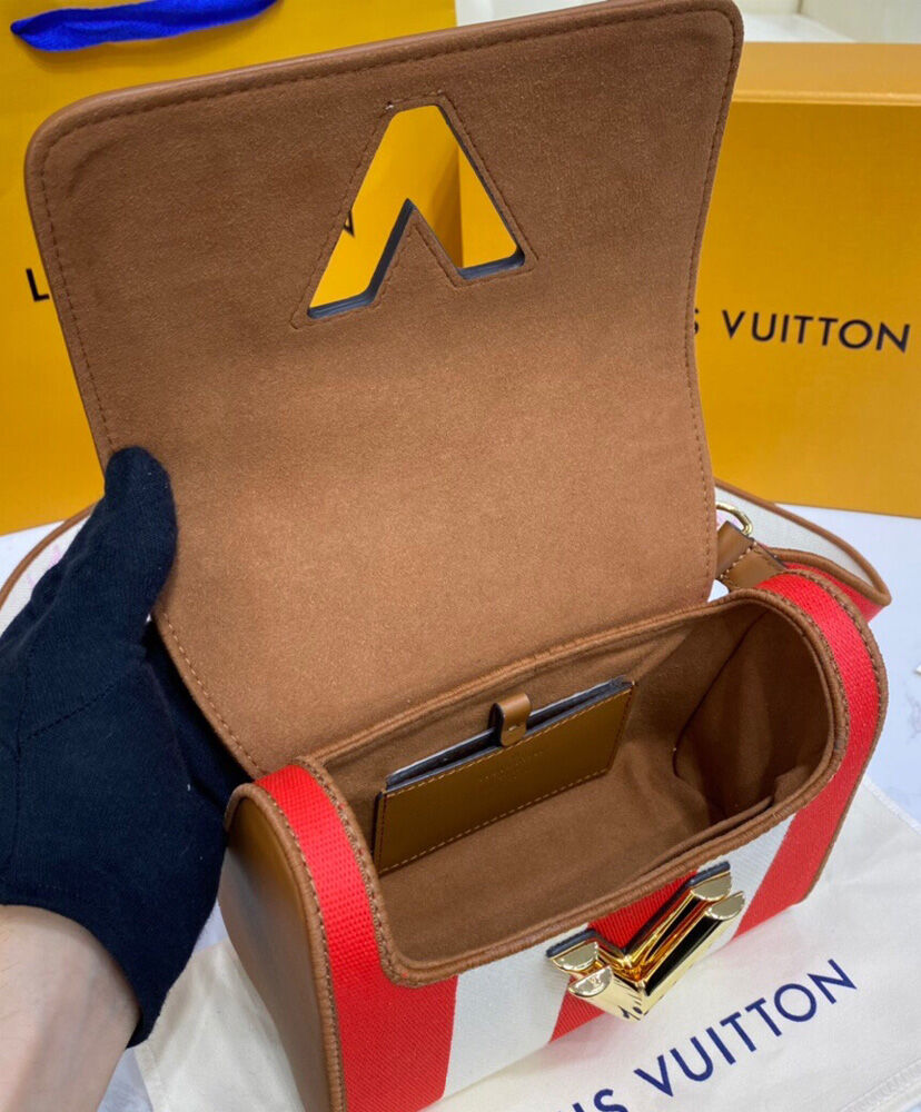 Part of the Parasol capsule collection, this Twist PM handbag stuns in a combination of striped canvas and natural calf leather. The visually striking stripes take on a more sophisticated feel thanks to discrete Monogram Blossoms embroidered along their edges. The wide removable strap enables shoulder carry.