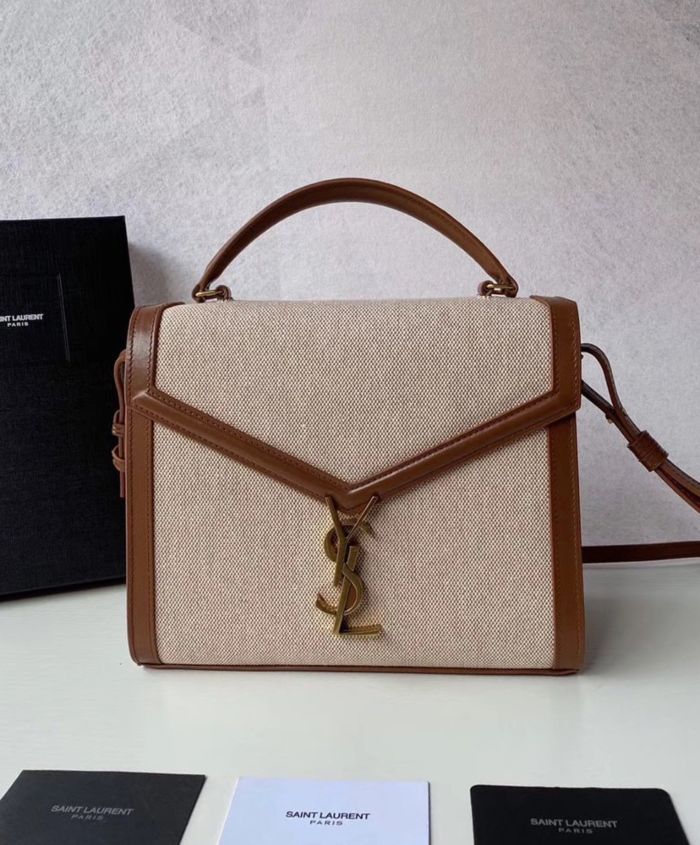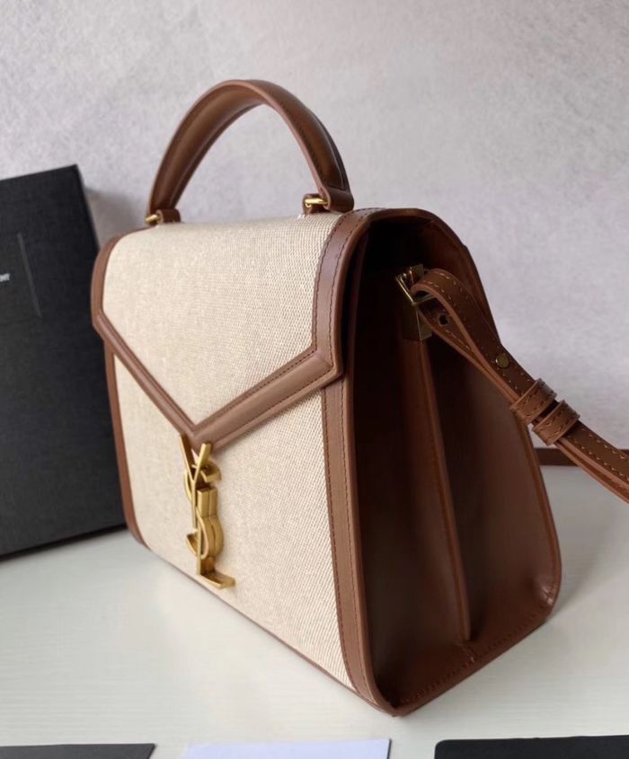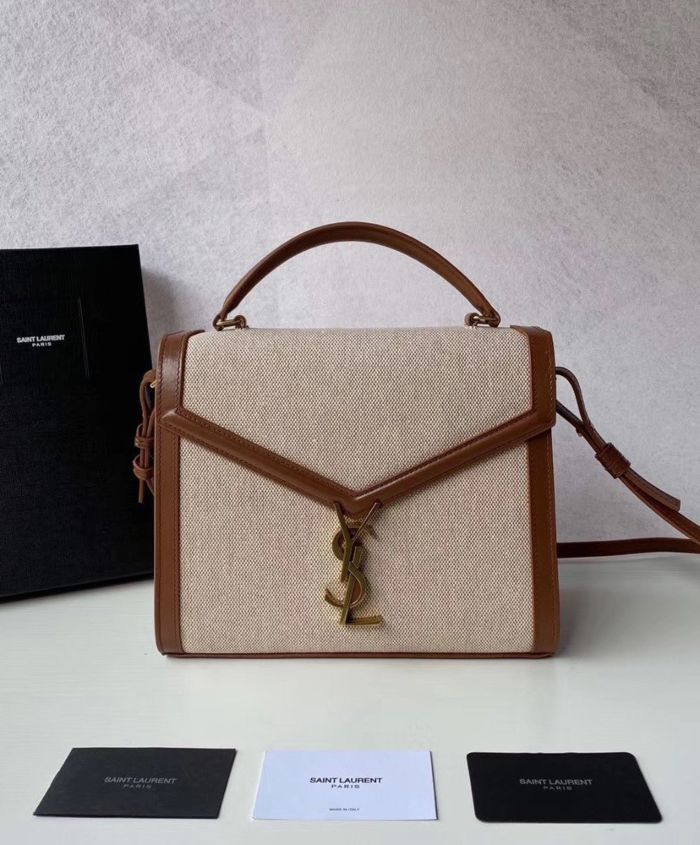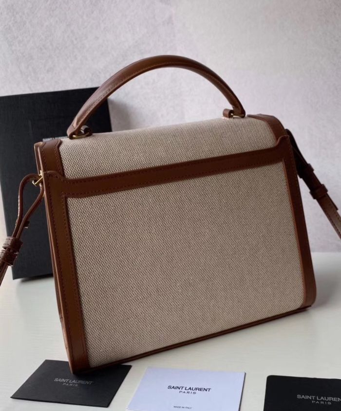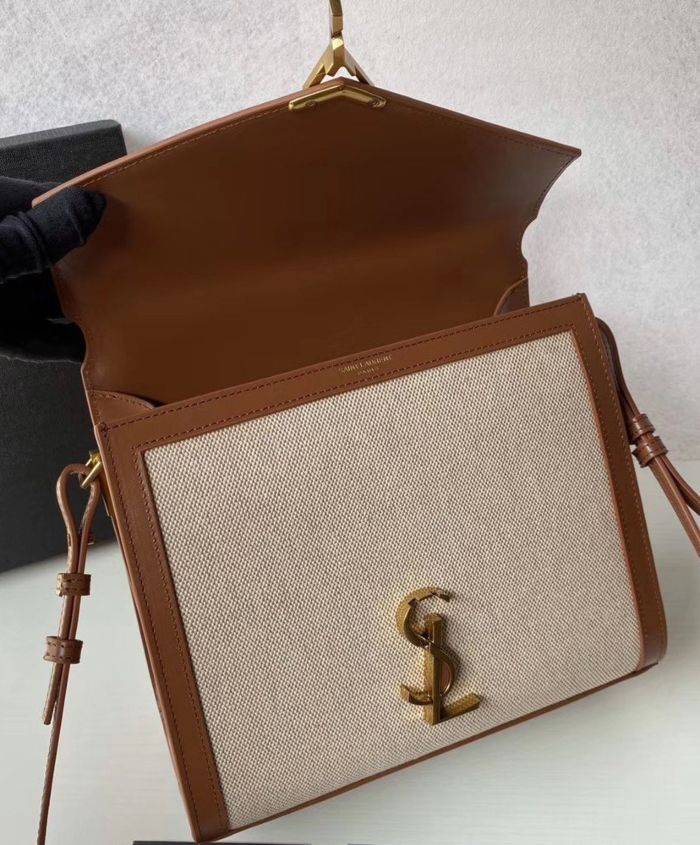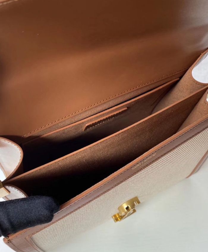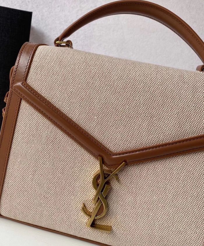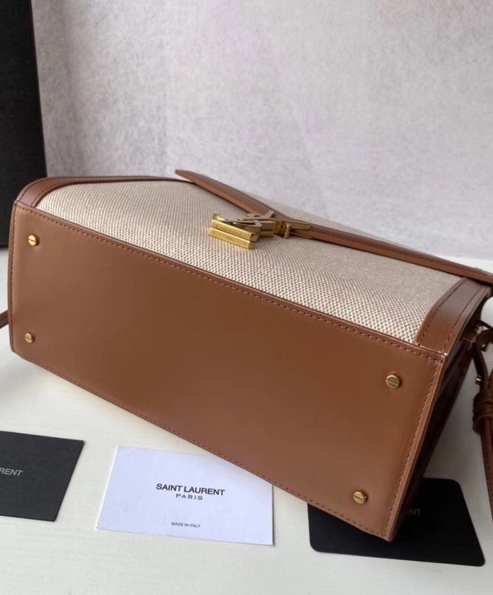 Bag with front flap and pivoting ysl metal closure, featuring a leather top handle and an adjustable and detachable shoulder strap.