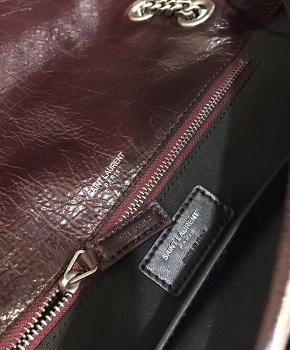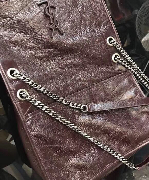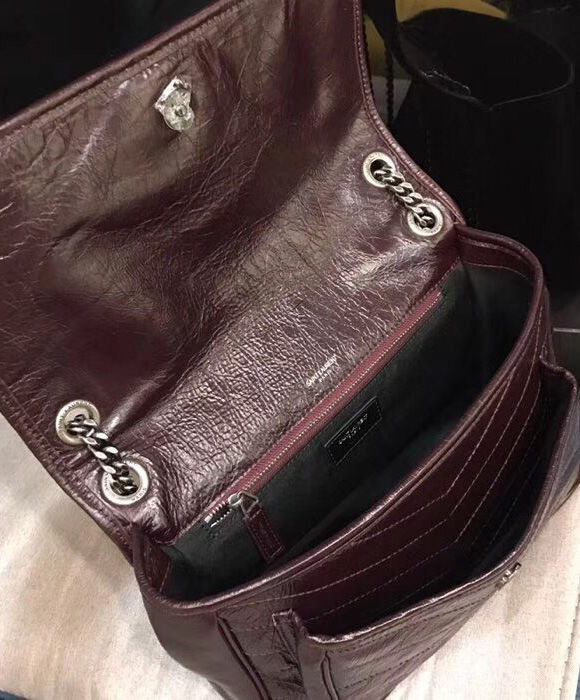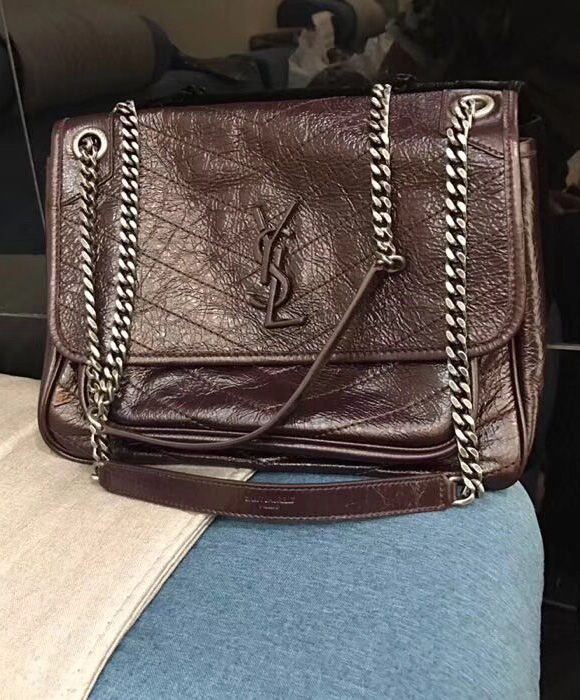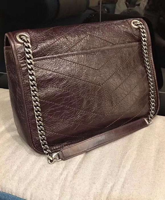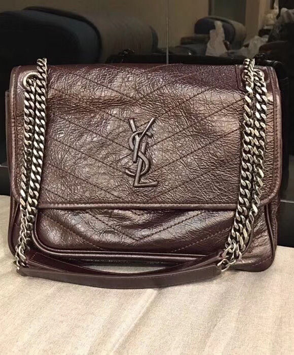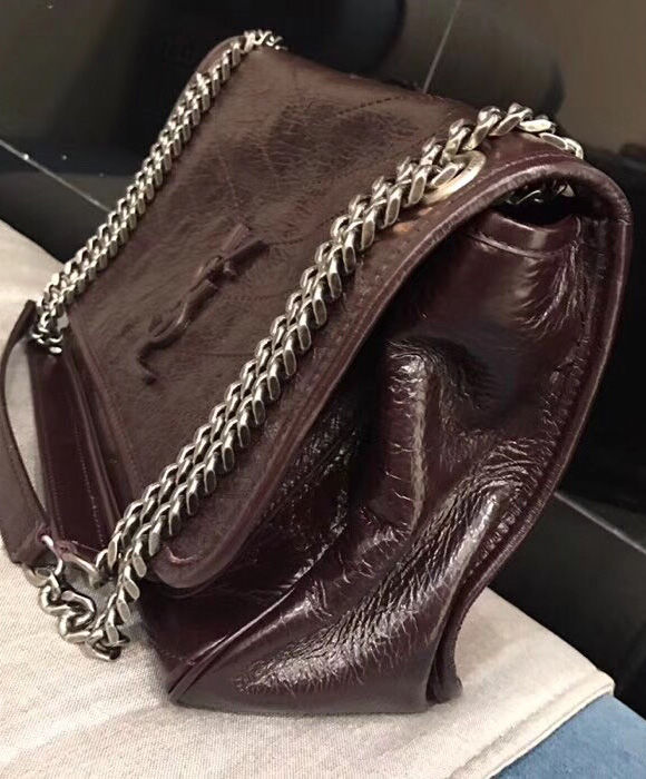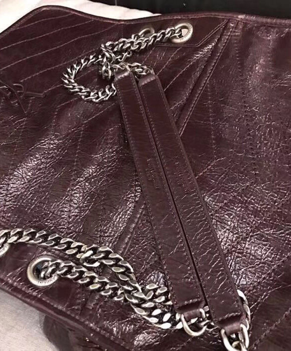 Saint Laurent monogram bag with front flap, leather-encased ysl monogram, chain and leather convertible shoulder strap, central compartment, and open bag pocket.