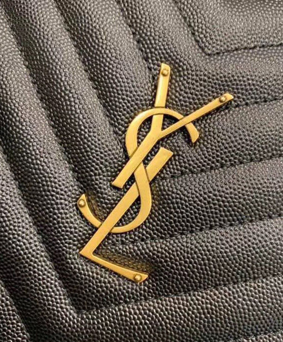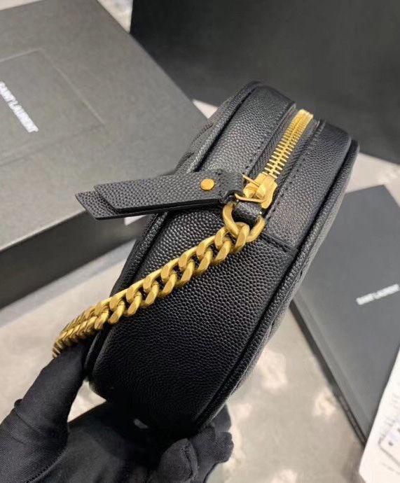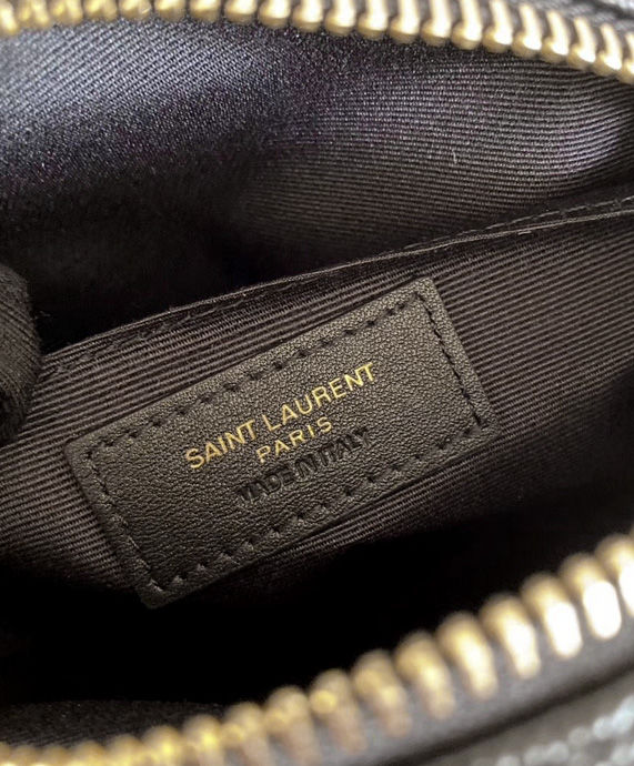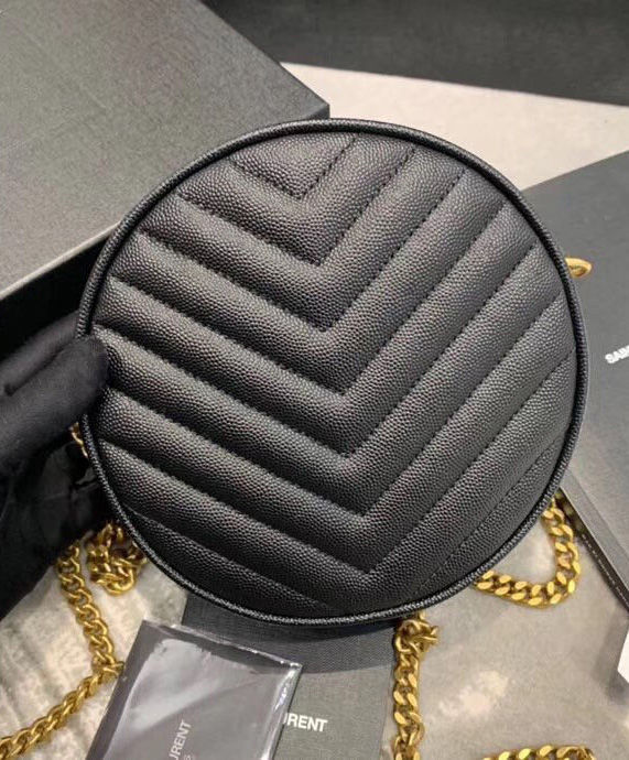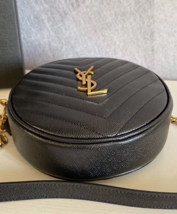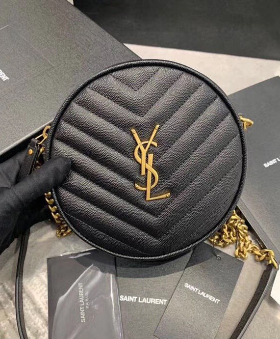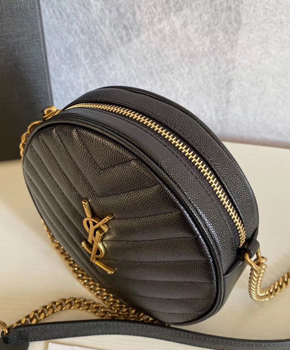 Round crossbody bag decorated with chevron quilted overstitching and metal ysl initials, featuring a chain and leather shoulder strap.