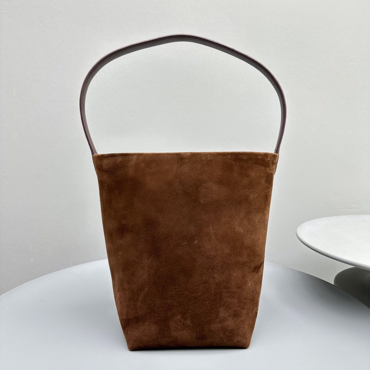 Structured top-handle bag in smooth saddle leather with signature belted side panels and subtly narrowed shape for hands wear.