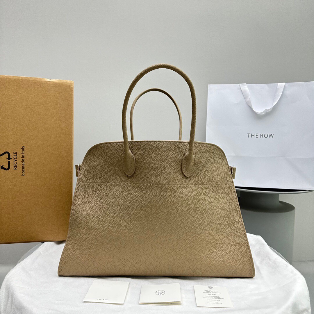 Structured top-handle bag in smooth saddle leather with signature belted side panels and subtly narrowed shape for shoulder wear.