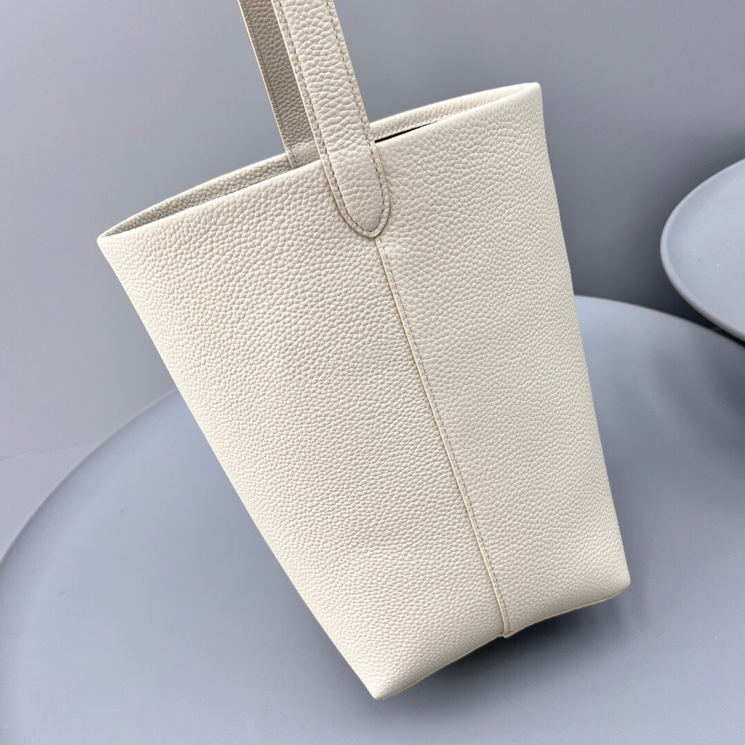 Structured top-handle bag in smooth saddle leather with signature belted side panels and subtly narrowed shape for hands wear.