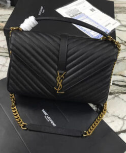 Quilted leather exterior with an envelope flap featuring a polished white metal YSL logo center strap, a flat zipper pocket at the back, a top leather handle and a thick oxidized metal link chain shoulder strap with leather shoulder support,Textile lining with Saint Laurent Paris heat embossed on inner flap closure and a leather tab,A central zipper pocket, a flat zipper pocket and an open flat pocket in the interior and a flat zipper pocket in the rear exterior,An envelope flap with magnetic snap-button closure